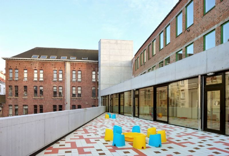Het kinderdagverblijf kreeg een plaats in de oksel van twee bestaande gebouwen toegewezen op de tweede verdieping. De voor het kinderdagverblijf voorziene oppervlakte bleek te klein en er was geen buitenspeelruimte ingepland. Het nieuwe ontwerp antwoordt op die noden door een deel van het kinderdagverblijf en de buitenruimte te realiseren in overkraging buiten het gebouw. De betonnen luifel zorgt dus voor de buitenspeelruimte van het kinderdagverblijf en deze luifel zal ook als afdak dienen voor de speelplaats van de naastgelegen basisschool.