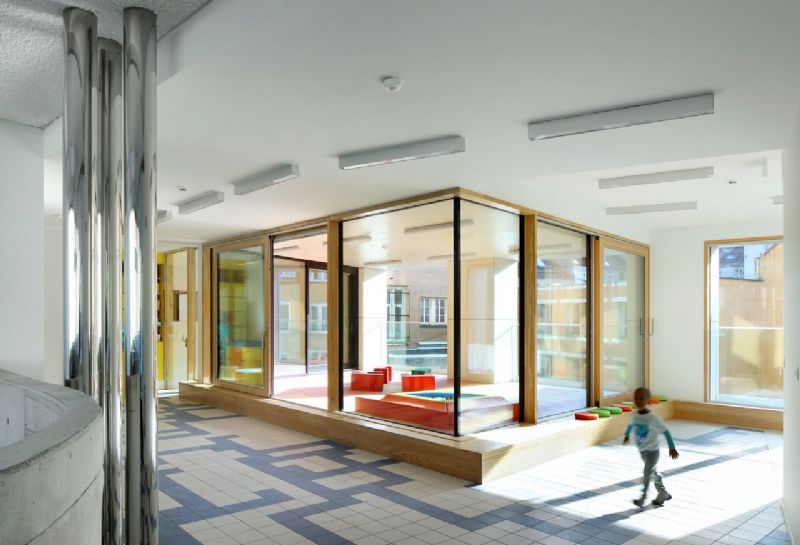 Kunstenaar Benoît van Innis ontwierp de verschillende tegelvloeren in het kinderdagverblijf. Hij bepaalde ook de kleuren van het meubilair in dialoog met die tegelvloeren. De kolommen die gebruikt werden om de grote gevelopeningen te maken in de bestaande en de nieuwe gevel, werden spiegelend uitgevoerd. De isolatie op het plafond van de verschillende leefruimtes voor de kinderen gebeurde met akoestische spuitpleister.