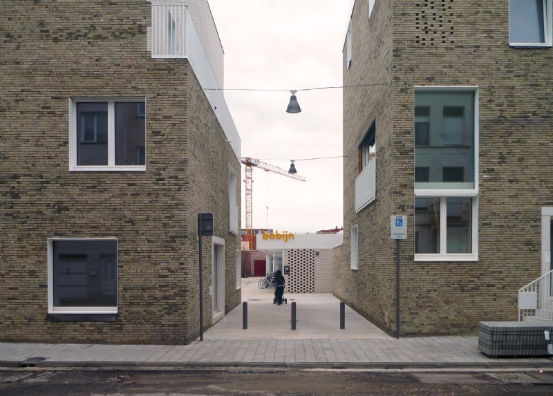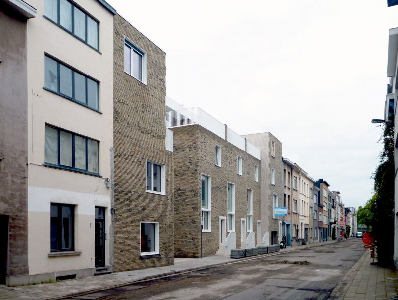 De volumes van de rij- en hoekwoningen worden gemodelleerd om subtiele aansluitingen, dakterrassen, toegangstrappen en zichten en lichten mogelijk te maken. Gevelvlakken in verschillende soorten gevelsteen komen samen op de hoeken als een stiksel in vroegere kostuums. Er ontstaat een subtiel gearticuleerde straatwand die de doorsteek naar het binnengebied aanzet, begeleidt en controleert.