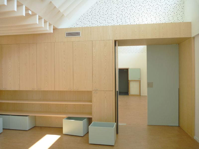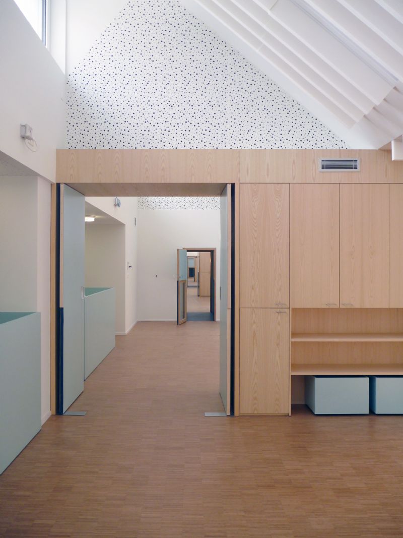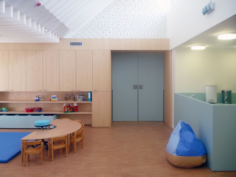 De carte blanche die de architecten kregen dankzij de totale herstructurering van het gebouw, gaf hen de kans om het kinderdagverblijf uit te diepen en te optimaliseren naar werking en beleving. Ook voor dit deel van het gebouw werd een klinkklare planopbouw gekozen in functie van overzicht en controle.