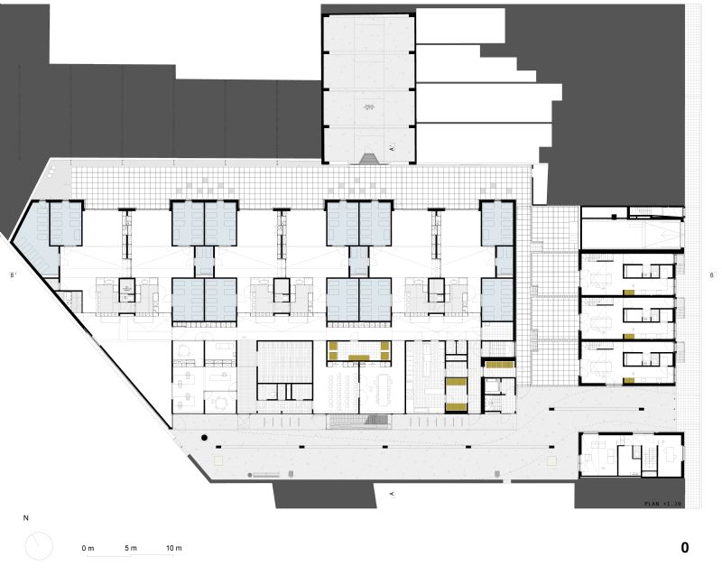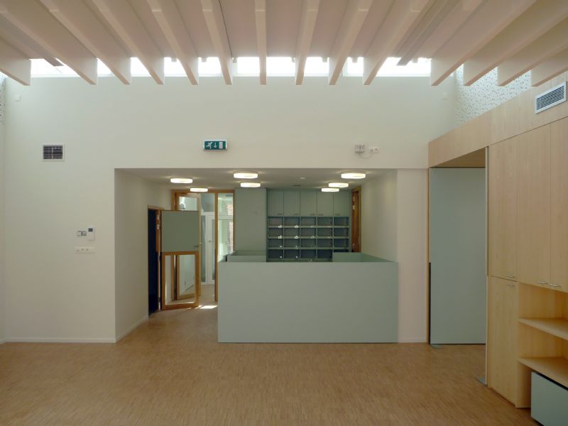 Om energie- en transmisseverliezen door de buitenschil te beperken, werd er gekozen voor een compact concept dat een kubus benadert. In de middelste zone is er daarom ook geen plaats voor uitsneden of patio’s: het energieverlies is het niet waard. In plaats daarvan plooit het dak omhoog in de middenstraat. Op die manier valt er genoeg licht binnen en kan het licht ook verdeeld worden over de aanpalende ruimtes. Inspiratie voor dit idee kwam van de klassieke sheddaken aan het gebouw.