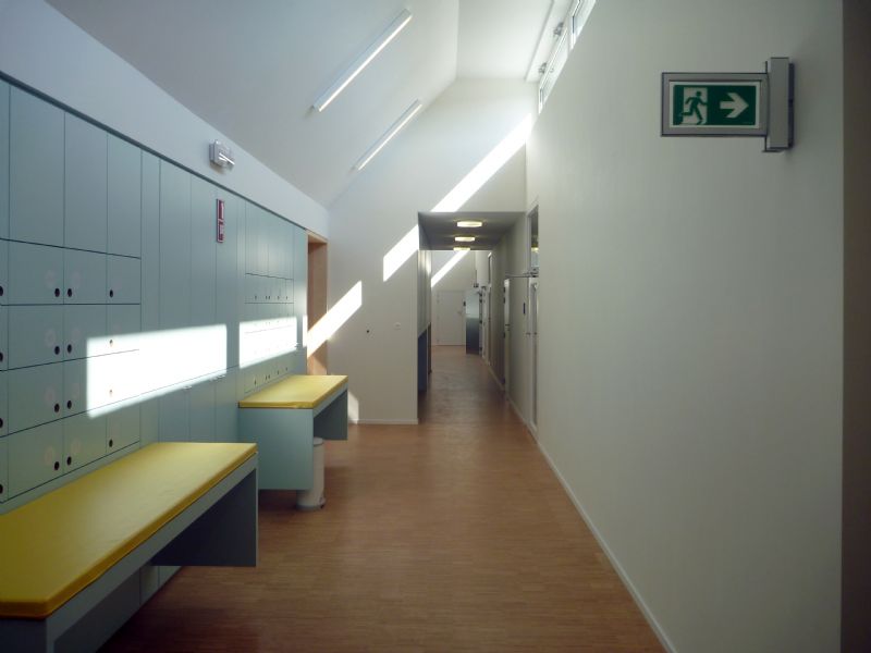 Uiteraard wordt ook zuinig omgesprongen met elektriciteit. Enkel de daklichten verlichten al genoeg. De lichtarmaturen werden bijkomend voorzien van daglichtdimming in alle ruimtes met daglicht. In kleedruimtes, sanitair en technische ruimtes is aanwezigheidssturing voorzien.