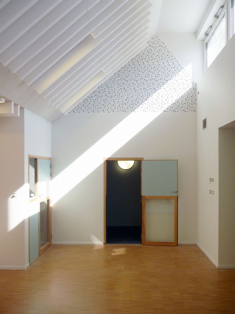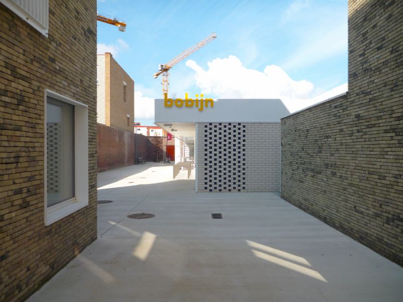 Het kinderdagverblijf krijgt een gelaagde organisatie: ondersteunende functies langsheen de publieke passage, centraal de interne circulatie, langs de ingesloten tuinstrook alle leefgroepen. Al deze functies worden in de lengte gebouwd met dwarse doorzichten. Deze leveren dwarse, gefilterde contacten, binnen en buiten het gebouw. Op die manier is er bovendien een natuurlijke overgang van publiek naar privaat: een garantie op rust en geborgenheid voor de kinderen.