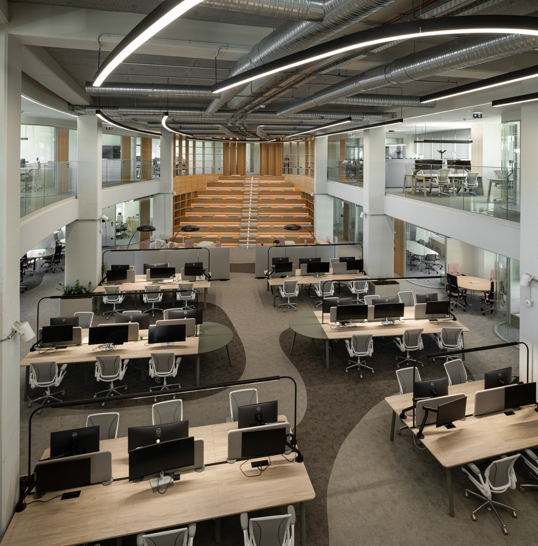Binnen de open kantoorruimtes wordt de vloer bovendien strategisch ingezet voor zonering of oriëntatie, waardoor verschillende functies subtiel van elkaar worden onderscheiden zonder de ruimtelijke openheid te verliezen.