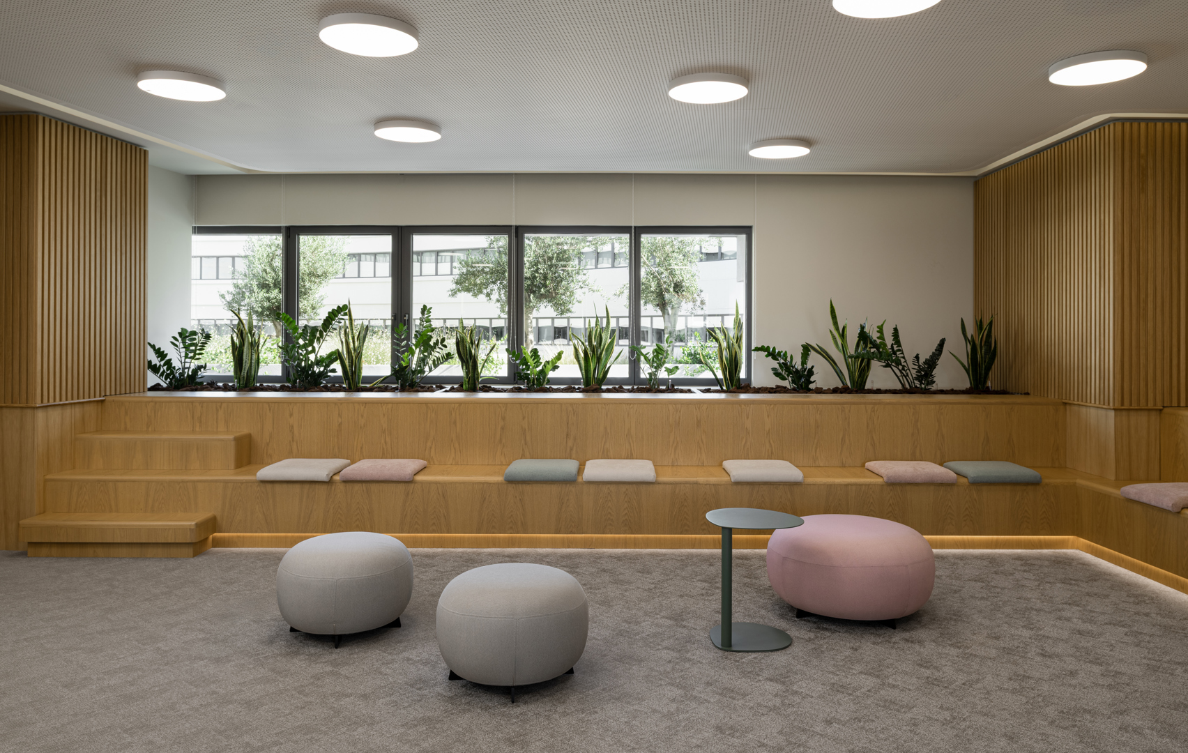 “Voor de PwC-kantoren wilden we een huiselijke en rustige sfeer neerzetten met een coherent pastelkleurenpalet in het volledige gebouw”, vertelt Christina Petsiou, Head of Offices Design bij Urban Soul Project. Die zachte tinten zorgen niet alleen voor visuele rust, maar versterken ook het welzijn van de gebruikers in een intensief gebruikte kantooromgeving.