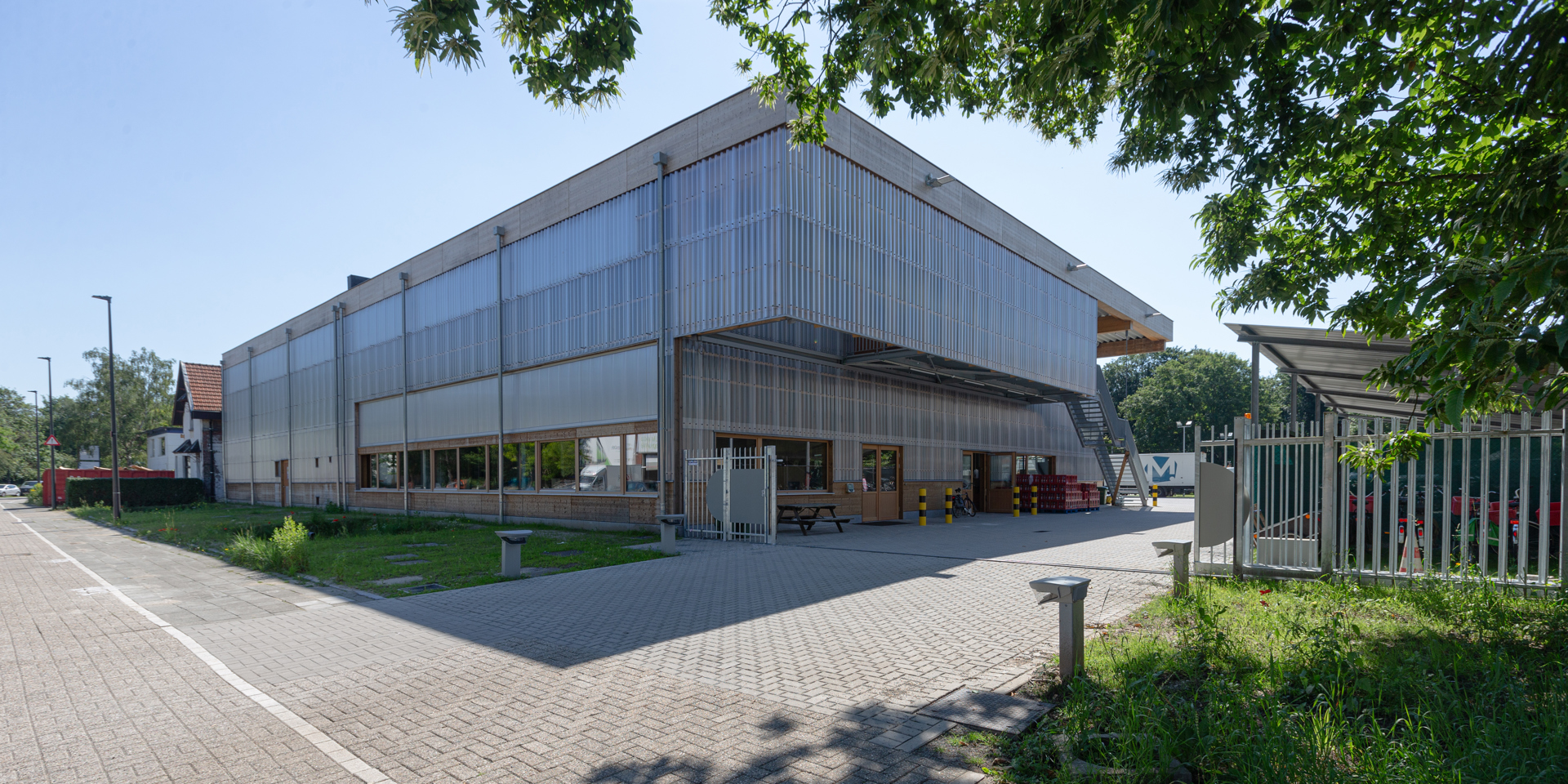 De gevel werd afgewerkt met gevelpanelen uit polycarbonaat omdat dit financieel de beste keuze bleek en zo een zekere transparantie naar de omgeving wordt bekomen. Ecologisch kan je dat materiaal uiteraard niet noemen, maar de panelen zijn wél demonteerbaar met het oog op hergebruik.