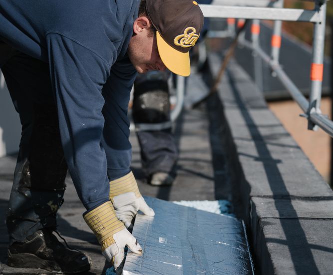 Voor de afschotisolatie werd gekozen voor Therma TR24 en Therma TT47. “Therma TR24 is een platdakplaat in PIR hardschuim met vezelvrije kern, aan één zijde voorzien van een gebitumineerd glasvlies en aan de andere zijde een mineraal glasvlies met een lambda-waarde van 0.025 W/m.K. De Therma TT47 is ook een PIR hardschuim maar een twee kanten voorzien van een mineraal glasvlies. De plaat voldoet aan de strengste brandveiligheidseisen en is toe te passen onder zowel verkleefde, mechanisch bevestigde als losliggend geballaste dakbedekkingssystemen en wordt gebruikt voor het creëren van afschot. De plaat is immers voorzien van een afwatering, waardoor er geen hellingchape moet worden aangebracht. Je hebt met andere woorden een lichtere constructie die er sneller staat. De lamdawaarde is dezelfde als die van de Therma TR24 en de plaat heeft een brandklasse E as placed.”