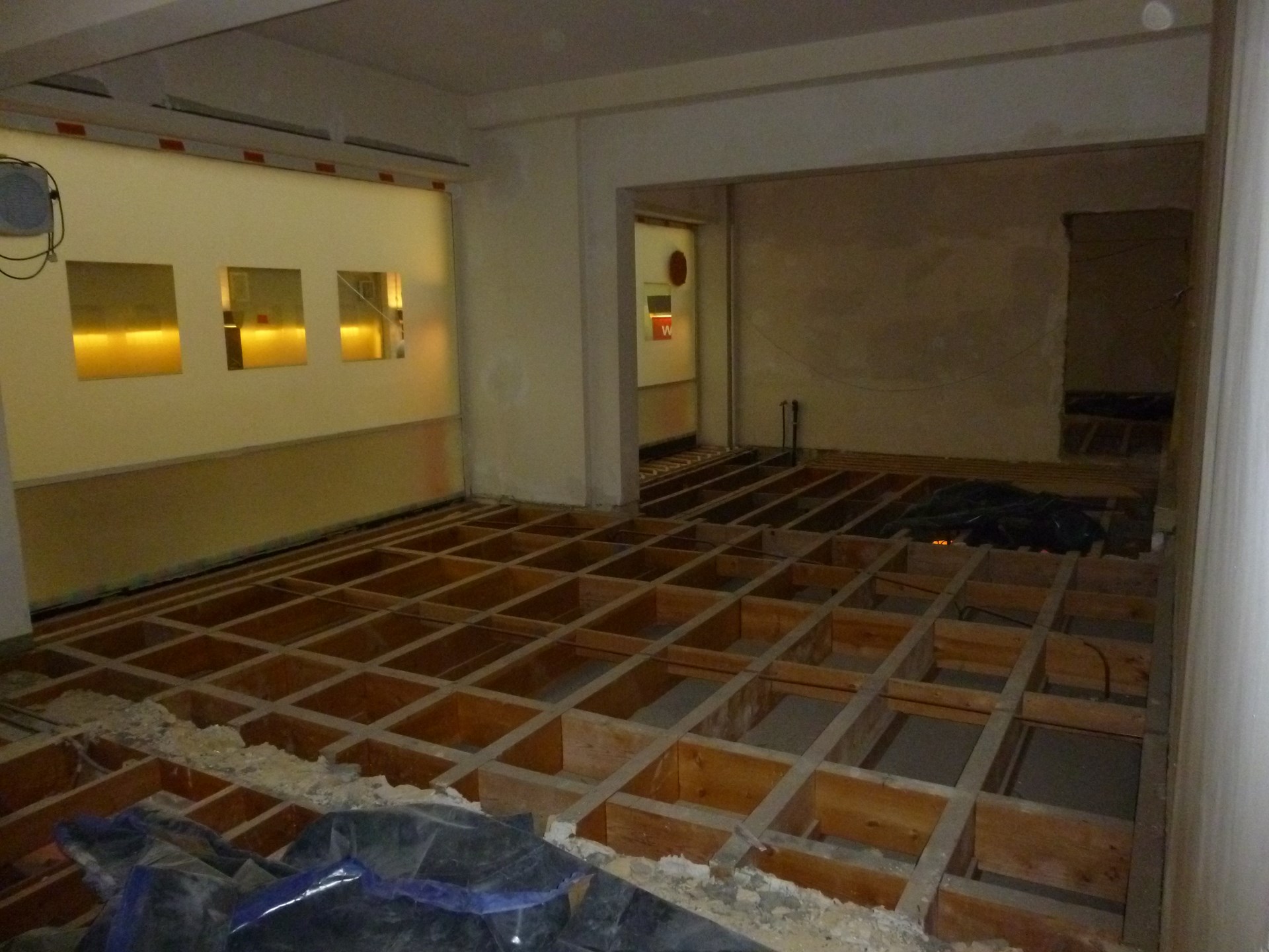 In samenwerking met CDM Stravitec werd een vloersysteem gecreëerd met behulp van Stravifloor Batten veerregels. Aannemer Via 73 installeerde deze veerregels op een nieuwe laag OSB en brandwerende gipsplaat, die op het bestaande houten rooster werd bevestigd. Tussen de veerregels werd een laag minerale wol aangebracht om resonantieboxeffecten te voorkomen. Bovenop deze wol werd een dubbele laag OSB-platen bevestigd. Tussen de twee lagen werden brandwerende gipsplaten aangebracht. Tenslotte werd een flexibele afwerking aangebracht met een elastische ontkoppelingsstrip aan de randen.