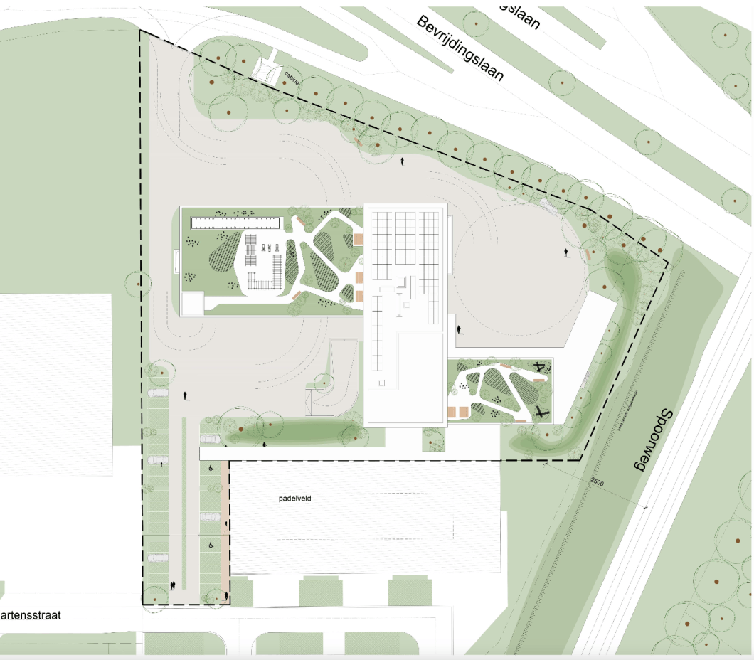 De tweede verdieping grenst aan twee rijkelijk met groen ingerichte daktuinen die zorgen voor aangename buitenruimtes voor zowel personeel als bezoekers. De derde verdieping wordt ingericht met aanvullende functies voor het verblijf, een fitnessruimte voor personeel op dienst en een crisisruimte die bij stroompanne operationeel blijft, samen met de dispatchingruimte op de tweede verdieping.