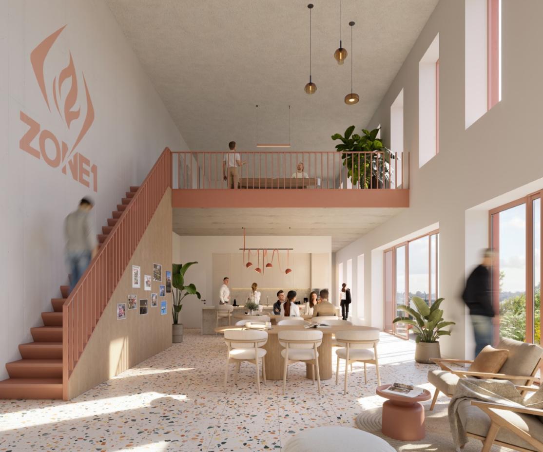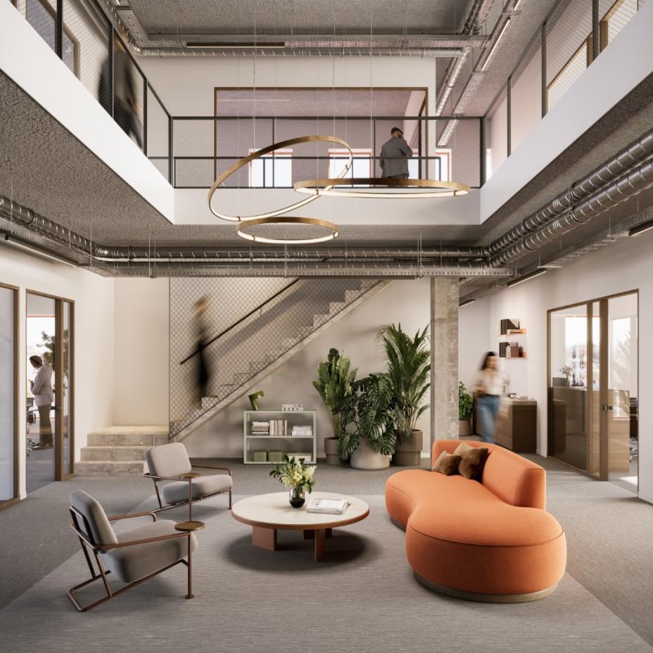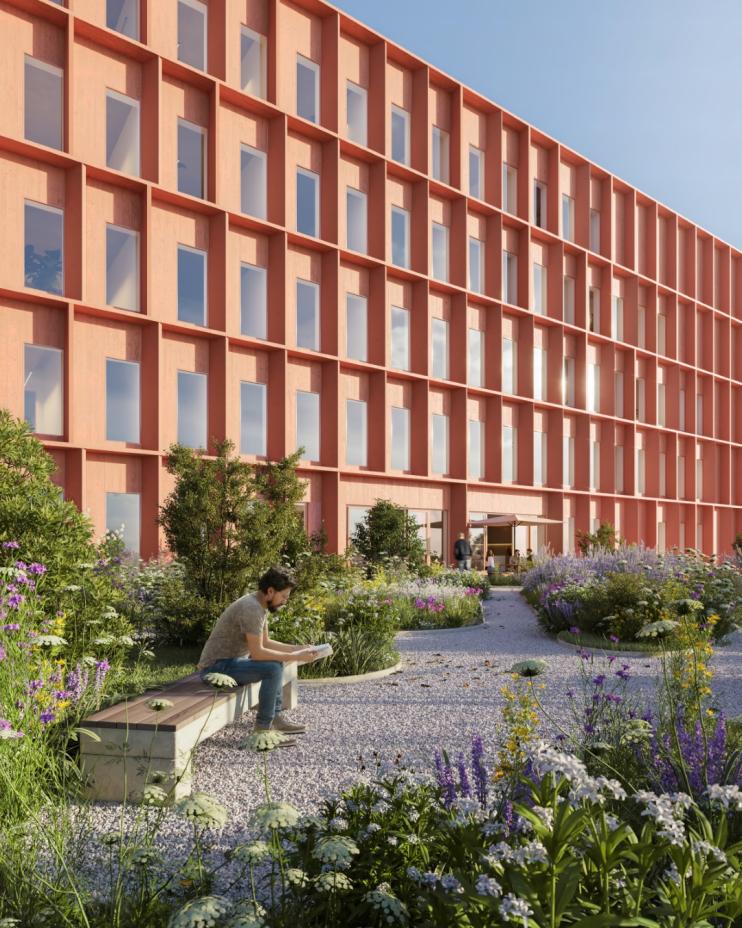 De materialiteit versterkt het robuuste, maar toch verfijnde karakter van het gebouw. De keuze voor industriële betonpanelen in terracotta kleur voor de plint geven het gebouw op hoogte van het gelijkvloers een stootvastheid die toepasselijk is voor de activiteiten die zullen plaatsvinden rondom het gebouw.