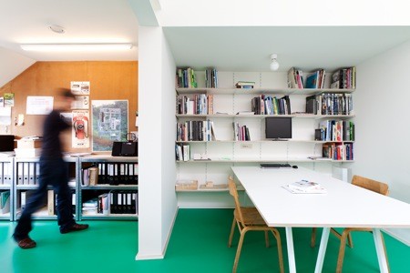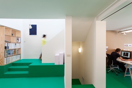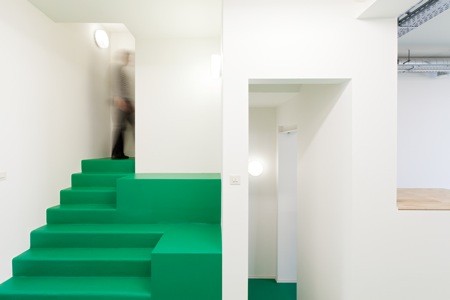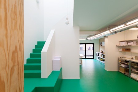 Alle technieken werden waar mogelijk in opbouw gemonteerd en zorgen voor maximale flexibiliteit. Alle bestaande vloeren, inclusief de trappen, werden bedekt met een groene gietvloer. Het vaste meubilair werd opgebouwd uit yellow pine multiplex, het losse meubilair werd eenvoudigweg samengesteld met schragen, platen en gegalvaniseerde magazijnrekken.