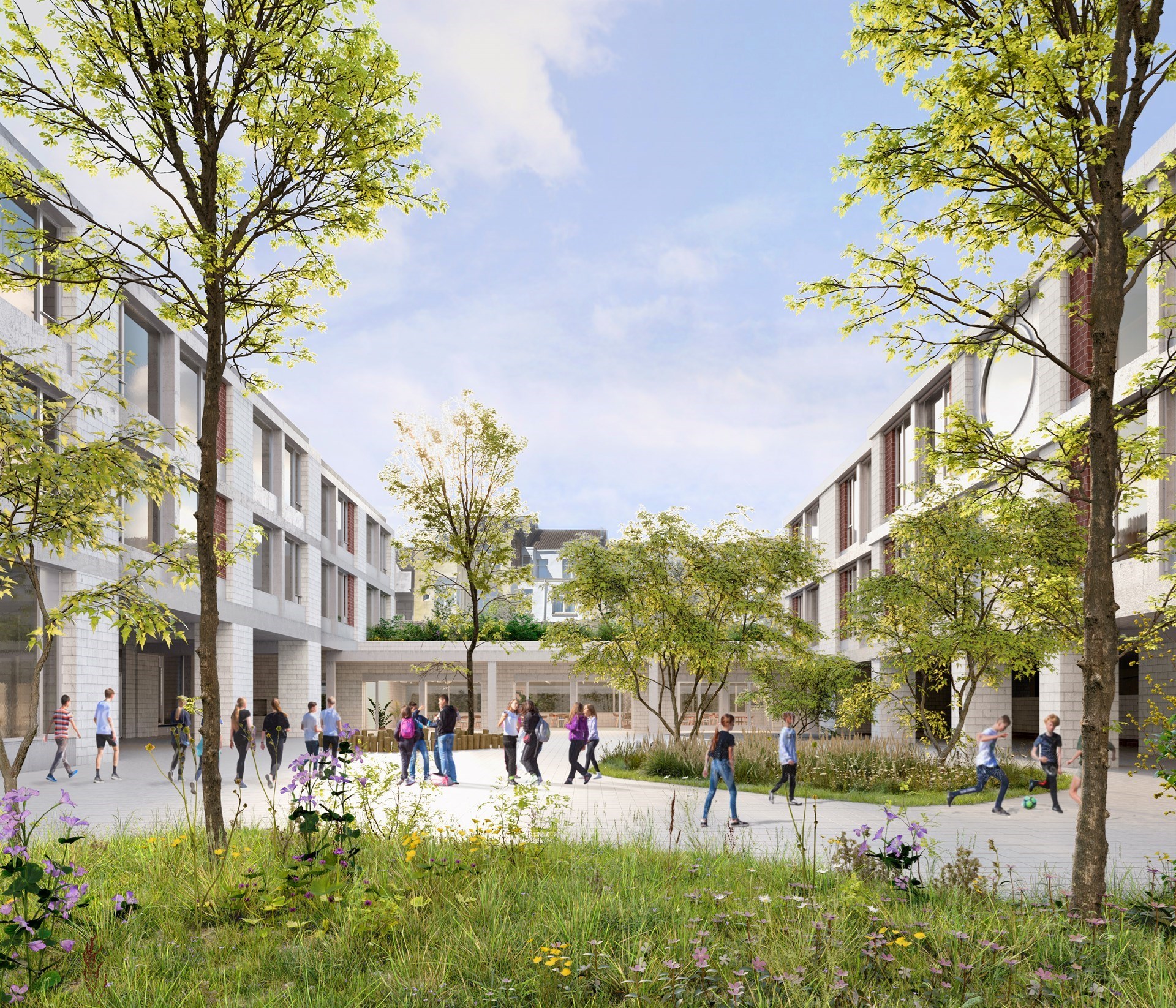 Aan de noordkant krijgt de school een polyvalente buitenruimte van meer dan 300 m², ideaal voor een buitenklas.