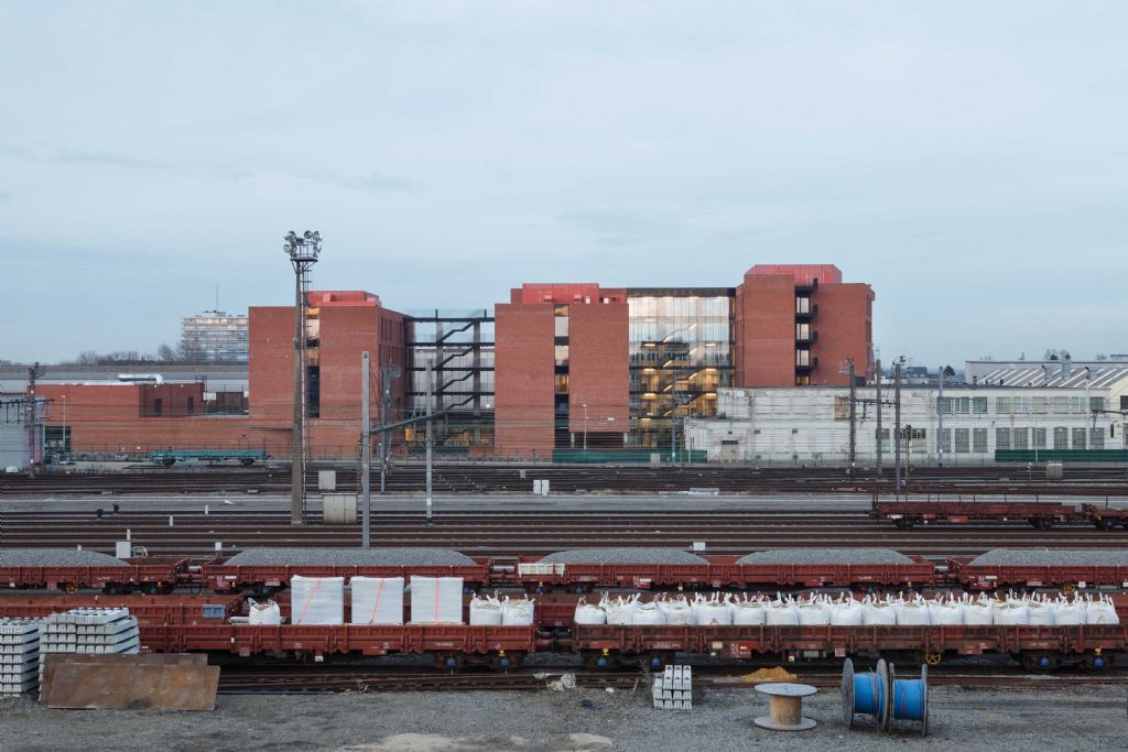 Op de ongemakken van deze moeilijke, langs de spoorinfrastructuur gelegen site, wordt handig ingespeeld door een aangepaste gevelopbouw. Om akoestische redenen wordt de gevel aan de kant van de spoorweg sterk gesloten gehouden. De gesloten vlakken in metselwerk staan in contrast met de opengewerkte gevels naar de speelplaats en sportvelden toe die de open en groene ruimtes vormen tussen en onder de gebouwen op de campus.