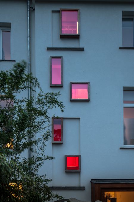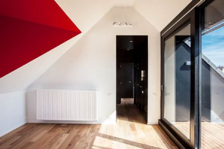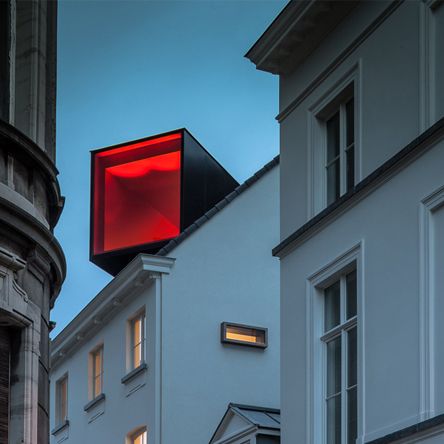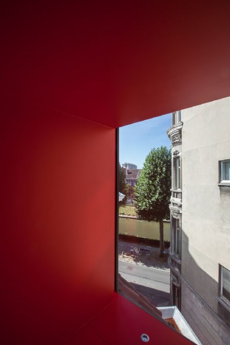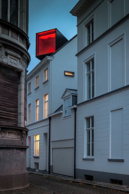 Deze collectieve huisvesting configuratie, gelegen in een smalle zijstraat, implementeert een geëxtrudeerde kubuscontainer, gedeeltelijk geplaatst binnen de bestaande dakconstructie. Dit betekent niet alleen dat een visueel baken toevoegd wordt aan de reeds bestaande neo-klassieke gevel van het gebouw, maar het waarborgt ook een zicht op de waterweg de Coupure. Door de integratie van de kubus-achtige functie in de structuur accentueert het levendige contrasterende effect van het rode interieur de architectuur tussen woningen.