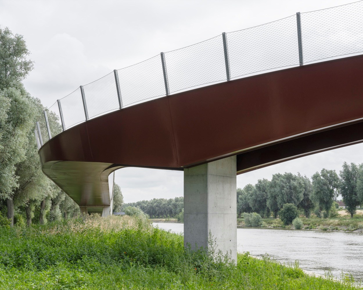 De structuur over de breedte van de rivier is opgevat als een symmetrische stalen boog, die het omgekeerde buigmomentdiagram volgt en zo een logische, organische vorm krijgt die past binnen het natuurlijke landschap. Op beide oevers verbindt een rechte, betonnen helling de centrale brug met de aangrenzende jaagpaden. Aarden hellingen op beide toegangswegen verankeren het geheel in zijn omgeving.