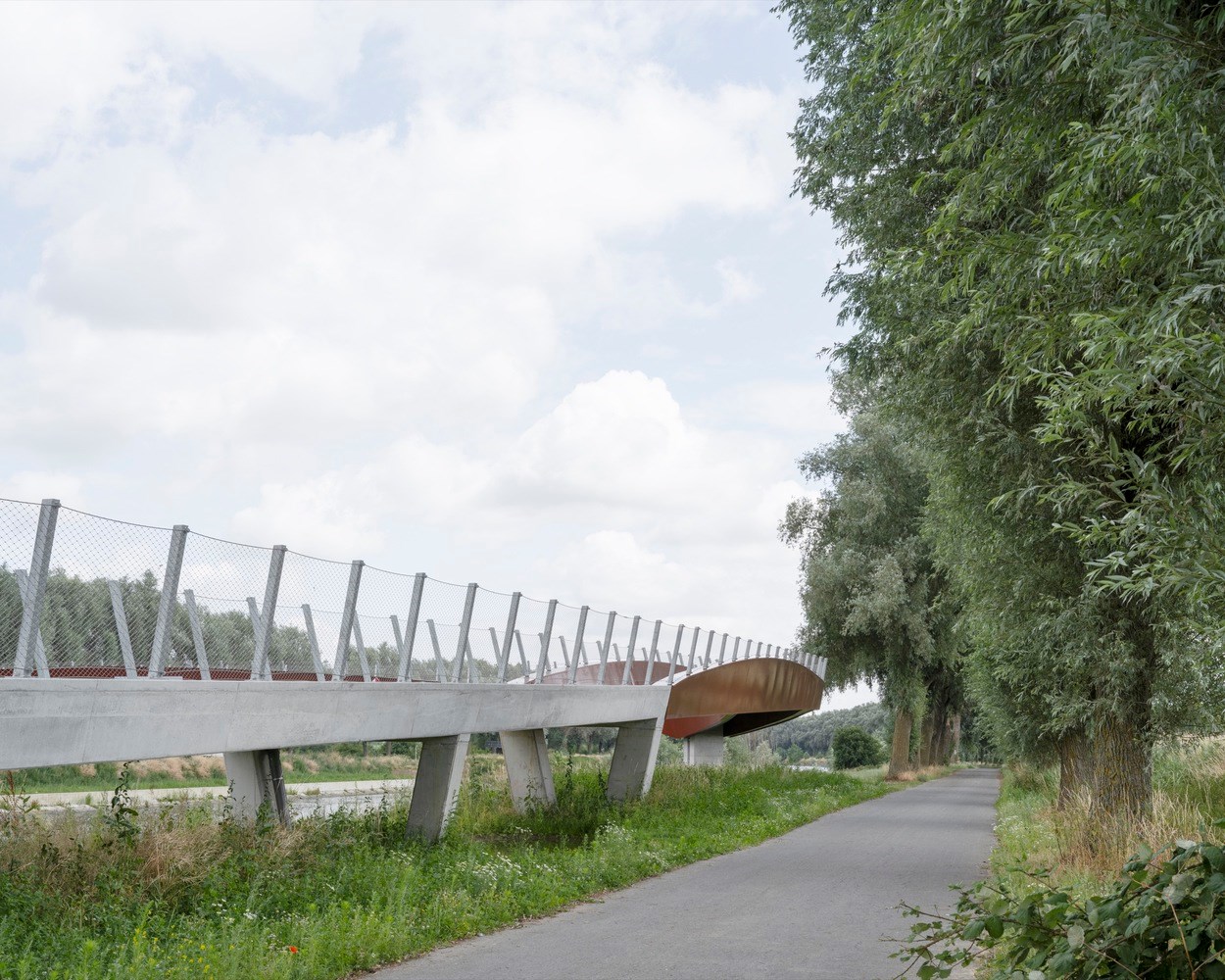 Jaagpaden naast rivieren en kanalen zijn vaak intensief gebruikte routes voor fietsers en voetgangers, zowel recreatief als functioneel. Om de functionaliteit van deze paden te verbeteren, was een verbinding over de Leie tussen de gemeenten Wielsbeke en Waregem noodzakelijk. De Vlaamse Waterweg gaf studie- en bouwkundig bureau SBE de opdracht een fietsers- en voetgangersbrug te ontwerpen die de rivier op een comfortabele manier overspant zonder het kanaallandschap of de ecologische waarde ervan te verstoren. SBE ontwierp daarom een sobere, nuchtere brug die harmonieert met zijn omgeving.
