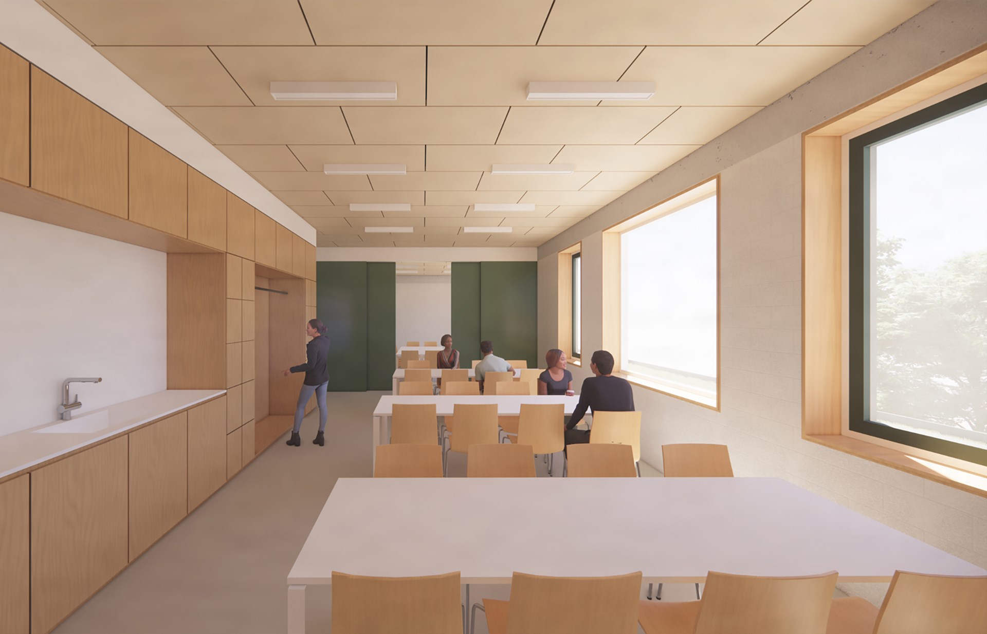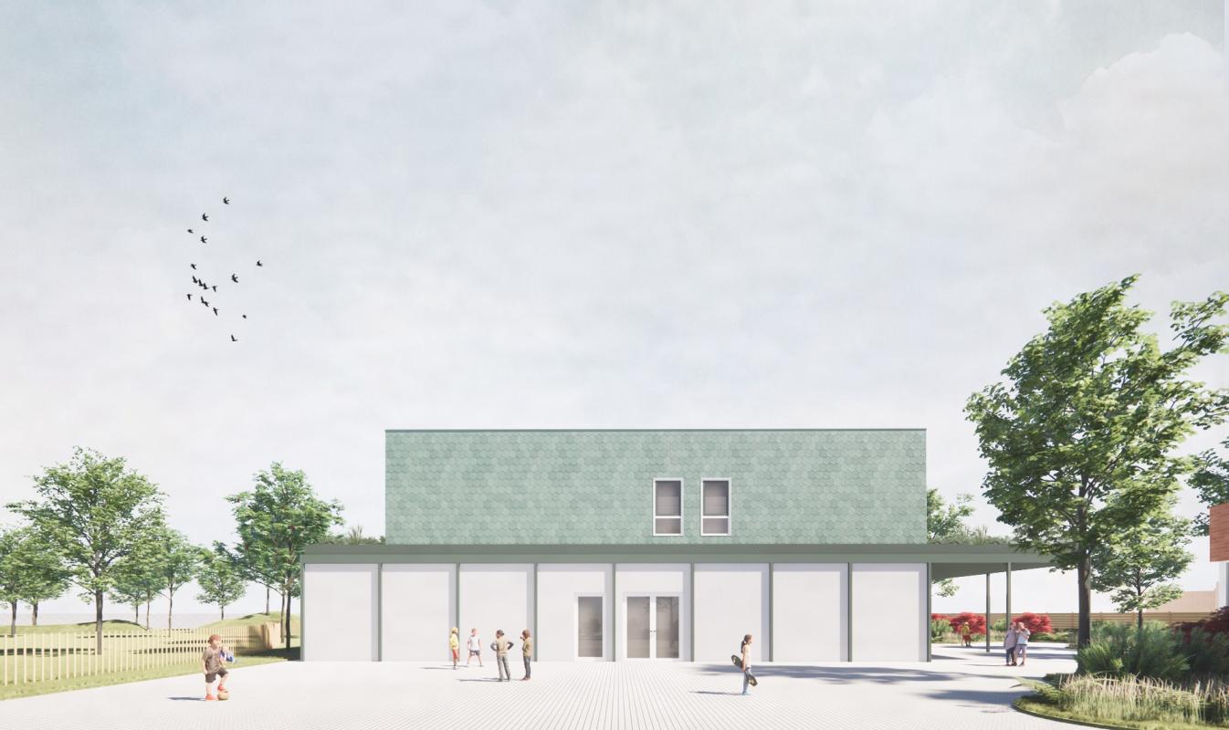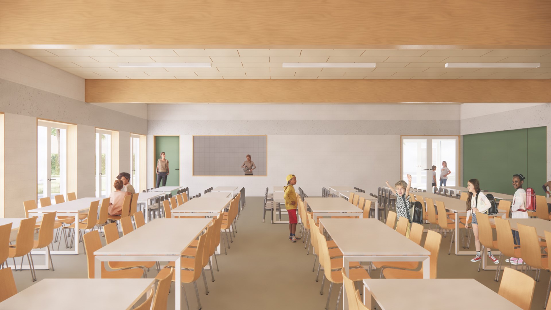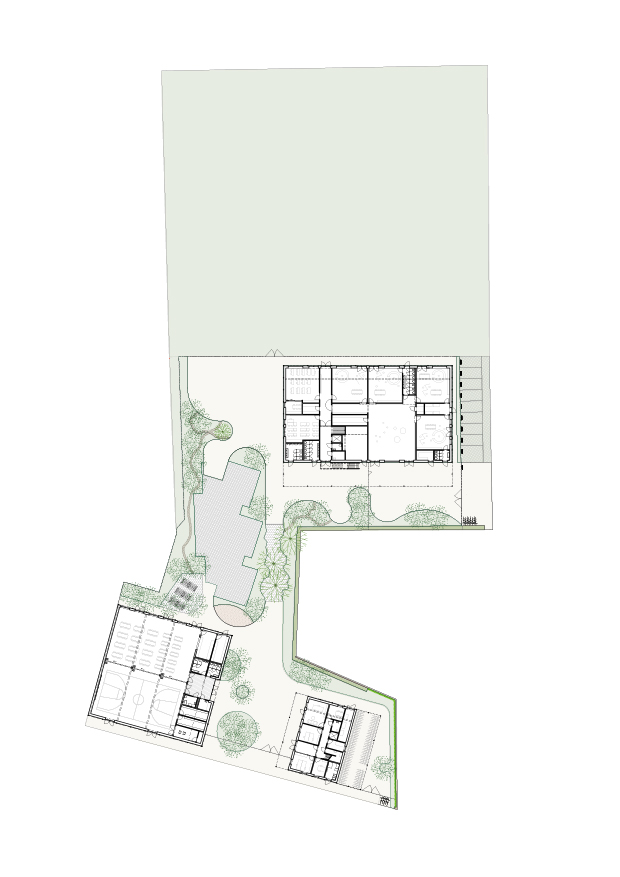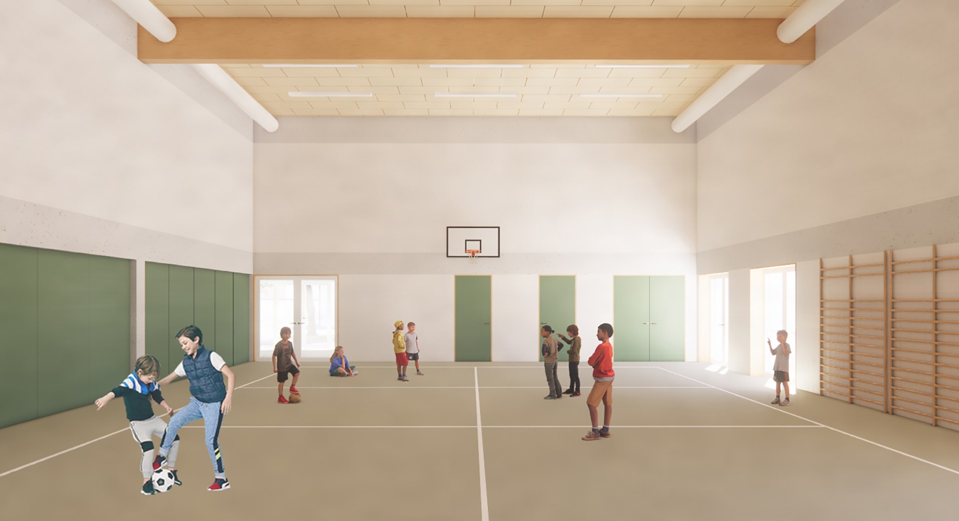 Waar voorheen een hoge bakstenen muur aan de straatzijde stond, worden nu twee nieuwe, lichte gebouwen geplaatst: een administratief gedeelte aan de rechterkant en een refter en turnzaal aan de linkerkant, die ook beschikbaar zullen zijn voor de lokale gemeenschap en verenigingen. Het centrale deel van de school, dat twee verdiepingen hoog zal zijn, komt achteraan bij het speelveld.