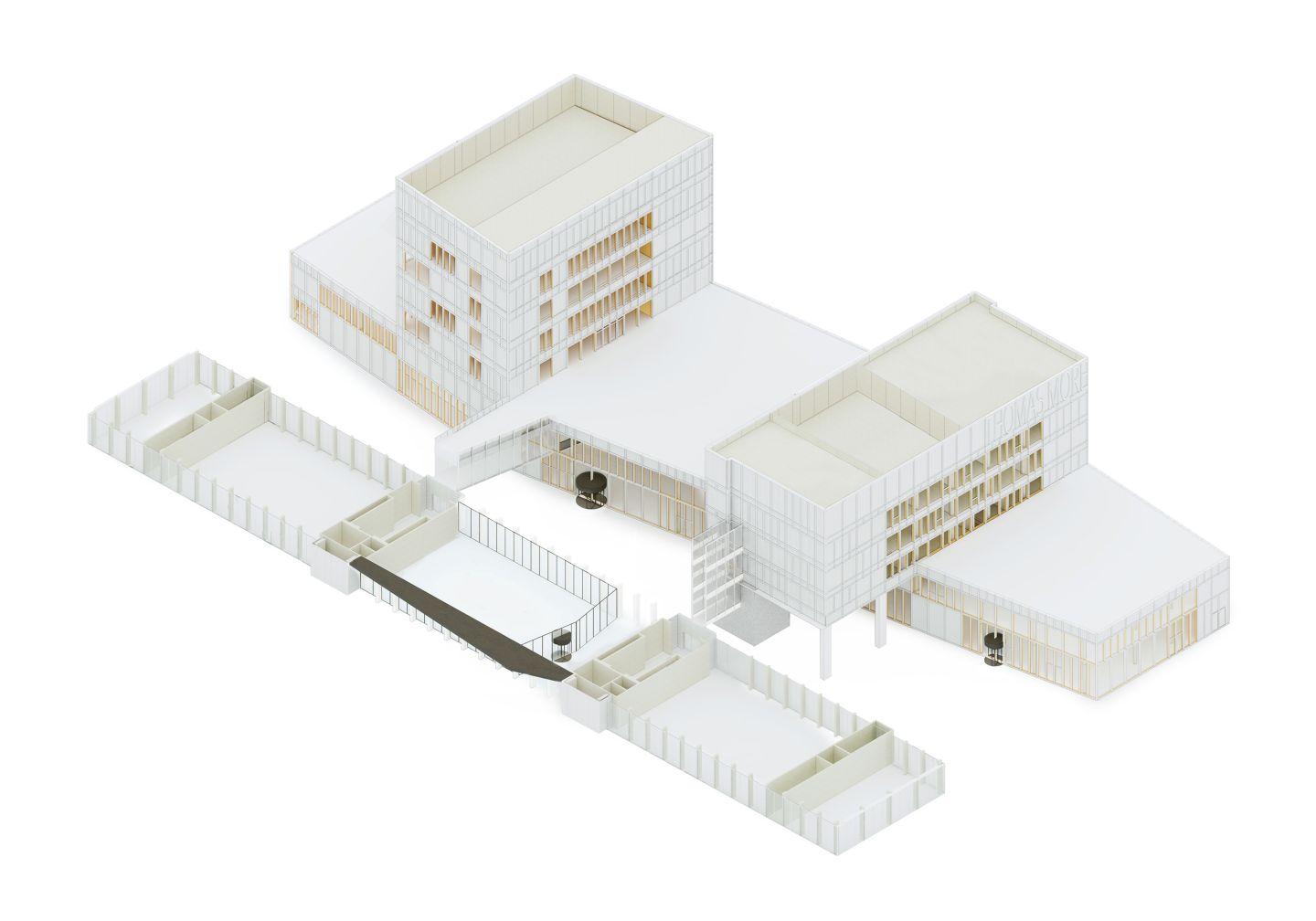 De architecturale vormgeving ondersteunt de werking van de campus. De opvatting van de sokkel en de positie van de grote aula en het nieuwe lessenblok erboven, zorgen voor een heldere lay-out van de school. De relaties en verbindingen met de bestaande gebouwen worden hertekend en verduidelijkt. De nieuwe binnenstraat kan op lange termijn nog verlengd worden zodat eventueel ook de Jeugdherberg zich slim kan inkantelen in de gestelde ruimtelijke ambities. De werking van Utopiastraat wordt krachtiger en haar publieke rol bijkomend bestendigd.