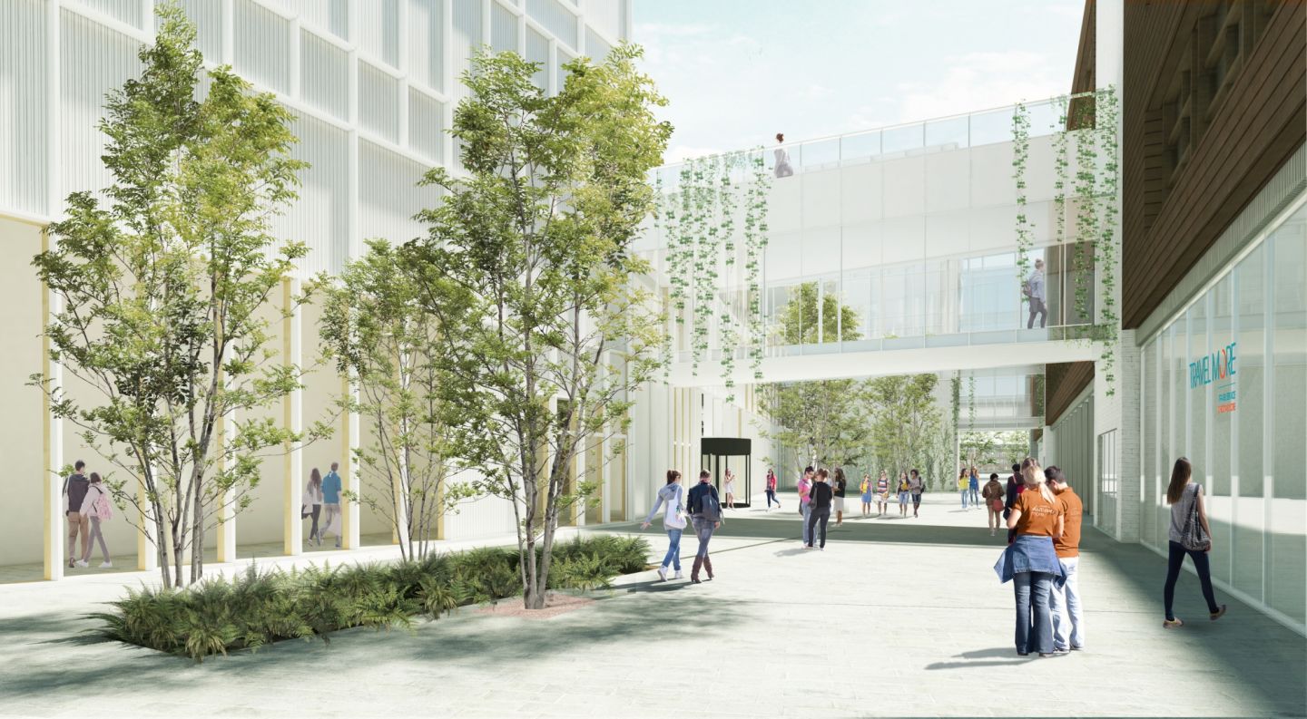 De huidige campus functioneert als een compositie van op zichzelf staande bouwvolumes. Het nieuwe ontwerp keert deze situatie volledig om en verzamelt de oude én nieuwe gebouwen omheen een centrale binnenstraat die alle onderdelen van de campus verbindt. Op deze manier wordt de campus opgevat als een stukje stad in de stad. Er is veel ruimte voor spontane ontmoeting en communicatie. Ook dat is een belangrijk deel van de opleiding.