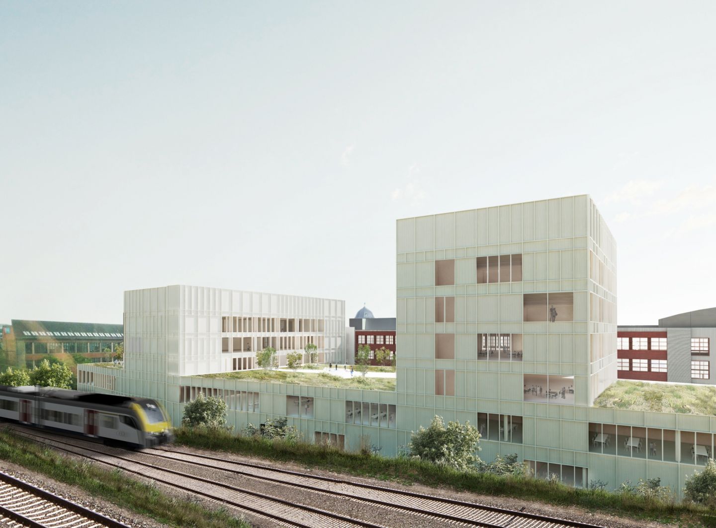 De nieuwe architectuur zet in op een sterk eenheidsbeeld van het ensemble en is attent voor zijn omgeving. De noodzaak van een aangepaste perforatiegraad van de gebouwschil in functie van de oriëntatie, resulteert in de keuze voor een modulair gevelsysteem. Zodoende wordt een maximale energetische performantie gekoppeld aan een optimale daglichttoetreding. Vliesgevels met een verticale geleding worden ingevuld met heldere 3-dubbele beglazing en matte structuurbeglazing voor isolatie. De glazen puien creëren een open, uitnodigend en transparant gebouw. Tegelijkertijd zorgt het hoogrendementsglas voor een diffuse reflectie van de levendige omgeving, het rustgevende groen en de veelkleurige hemel waardoor het gebouw ook visueel zijn omgeving verbindt.