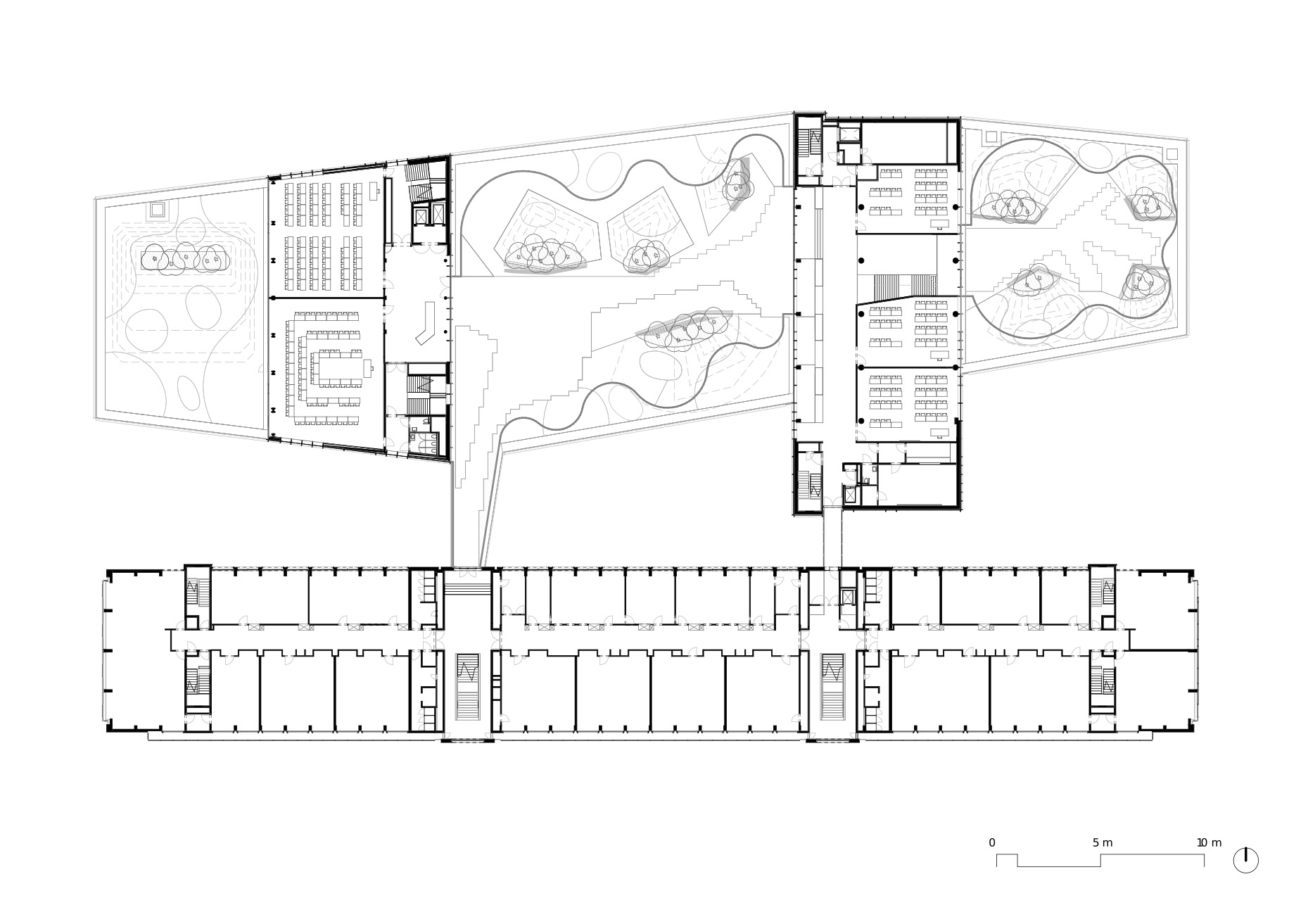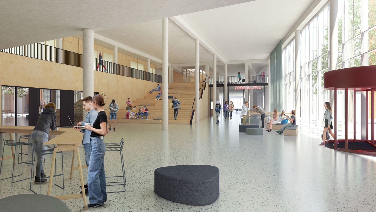 "Door de gevel alzijdig te verbeteren en het campusleven -ook na de lesuren- te exposeren op de nieuwe daken, toont de school zich als een open campus aan de buitenwereld."