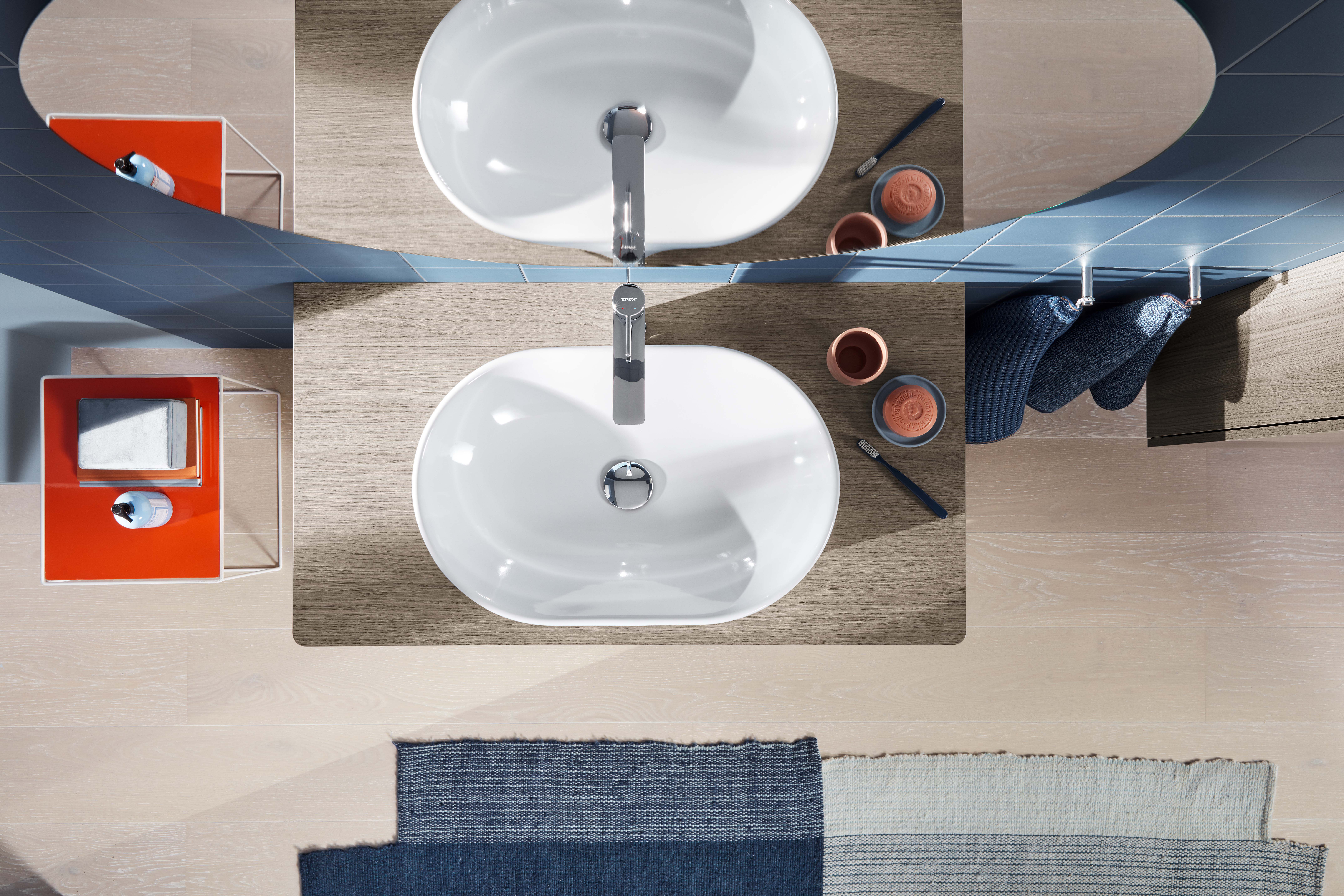 De D-Neo kranen, die de ronde opzetwastafel aanvullen, overtuigen door hun strakke en geometrische karakter voor een ingetogen maar expressief effect. De D-Neo wasplaats wordt vervolledigd door een grote, ronde spiegel die voor een indirecte verlichting zorgt en zo een aangename verlichting van de wasplaats garandeert. Aanvullend: ovale D-Neo opzetwastafel (600x400 mm) en D-Neo mengkraan.