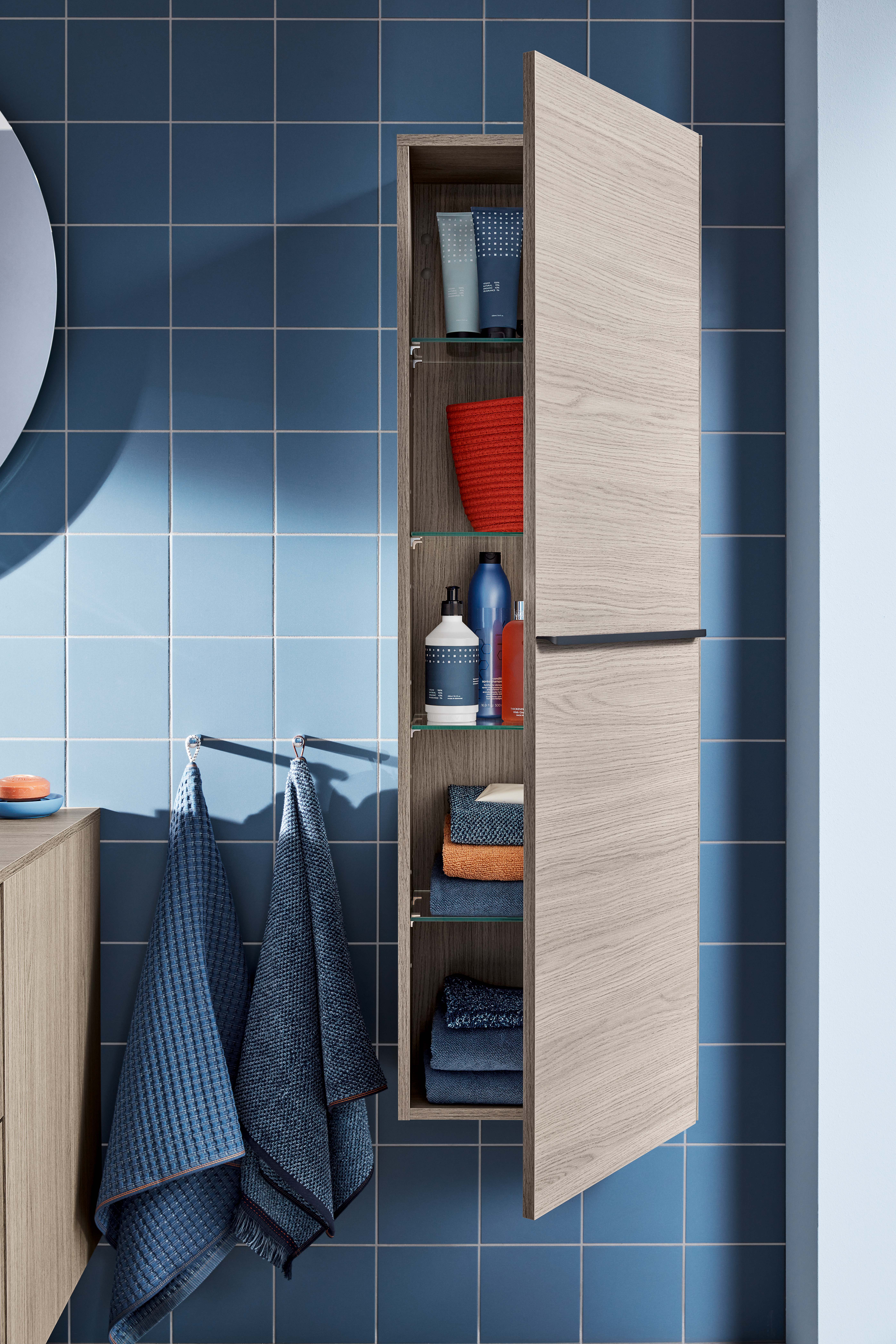 Het strakke design van de wandgemonteerde D-Neo toiletten sluit aan bij het harmonieuze totaalontwerp van de reeks. Met Duravit Rimless® technologie en optioneel verkrijgbaar met het antibacteriële HygieneGlaze keramische glazuur voor het summum van hygiëne en comfort. De consequentie van de D-Neo serie komt ook tot uiting in de hoeveelheid beschikbare opbergruimte. Hier biedt de halfhoge kast in Eiken Terra (35) een zee van ruimte.