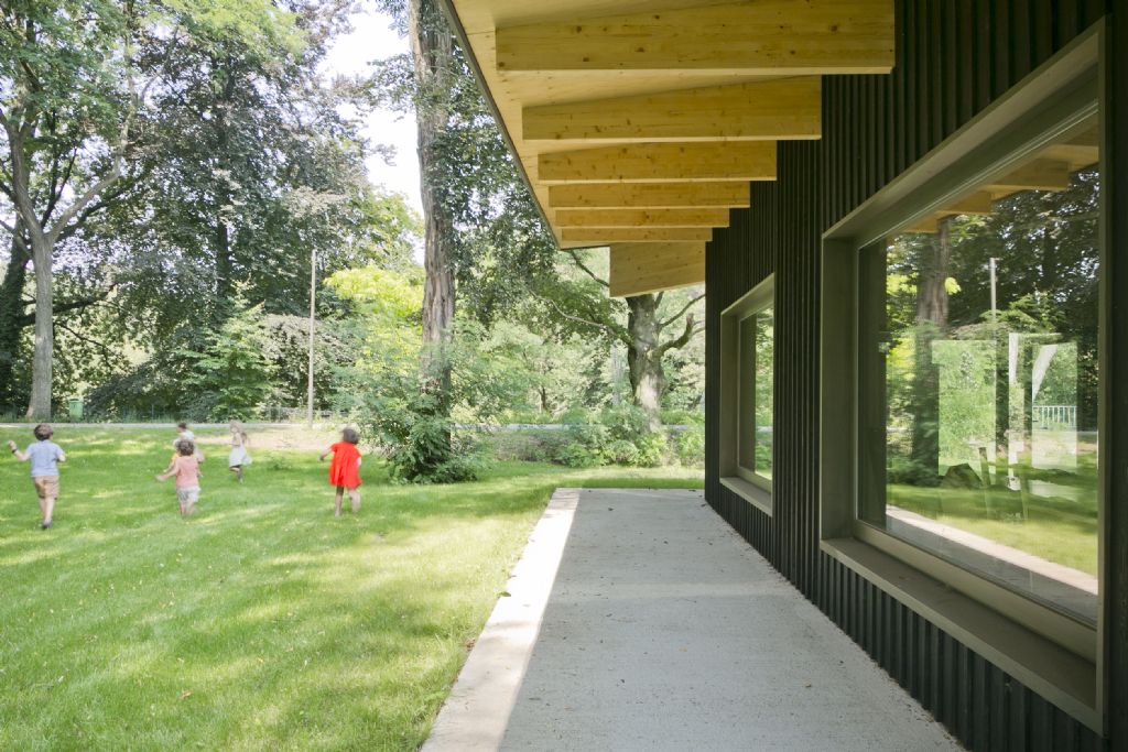 Na een nauwgezette boominventarisatie bepaalde HUB de definitieve locatie van de nieuwe klaslokalen. De ontwerpers kozen voor een compacte plattegrond om de ecologische voetafdruk zoveel mogelijk te beperken. De vier klassen vormen samen een paviljoen waarvan de op-en-neer gaande daklijn prettig contrasteert met de bomen in het park.
