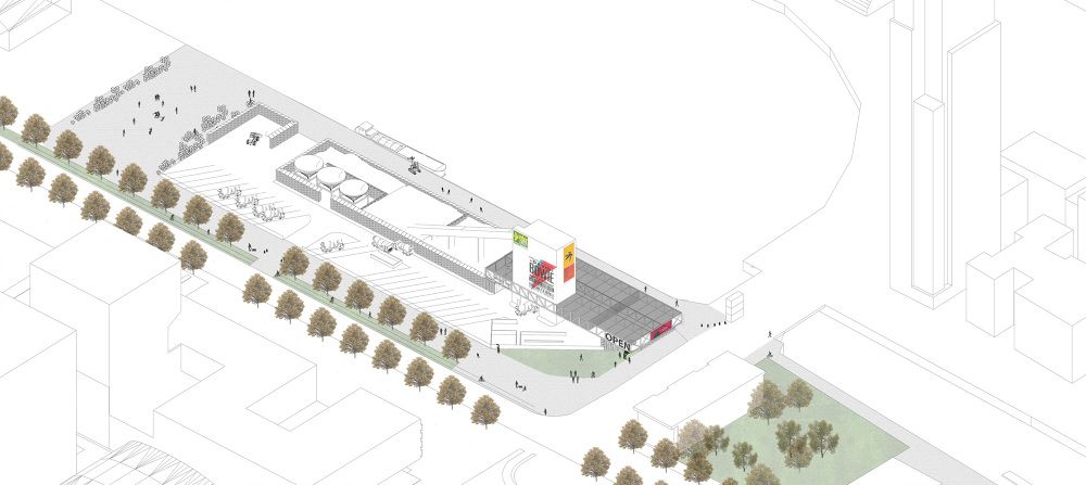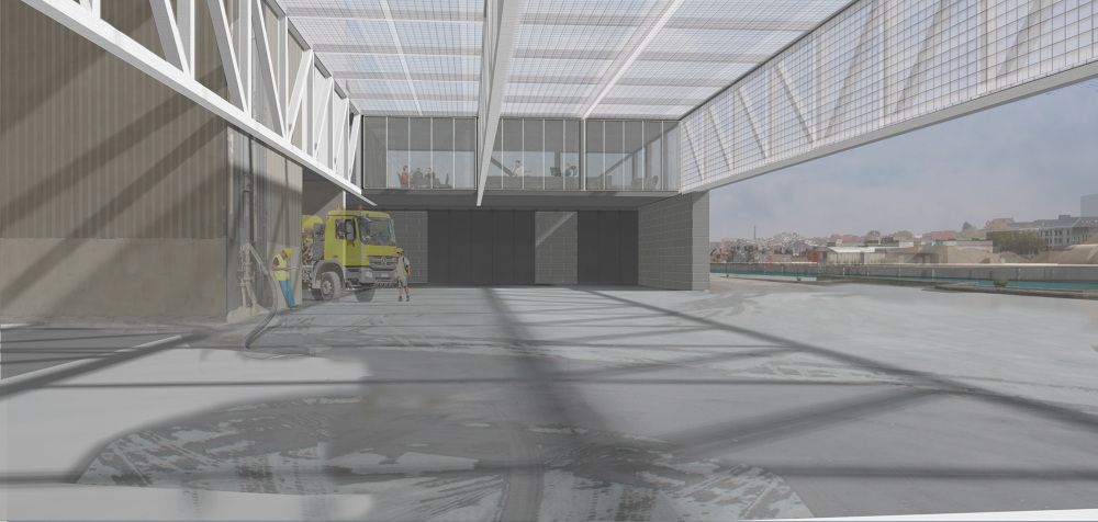 Om de geluidshinder tegen te gaan, wordt het afgeschermd. “Het geluid kan niet geabsorbeerd worden. Om het af te schermen wordt er een luifel over geplaatst. De meeste overlast wordt veroorzaakt door het laden en het spoelen van de vrachtwagens. Door een dak wordt dat afgeschermd.” Dat dak beschouwt BC architects & studies als een kast waar je functies in kan steken. “Vanachter zitten de kantoren van Inter-Beton. De plaats in de kop van het gebouw kan een publieke functie dragen.”