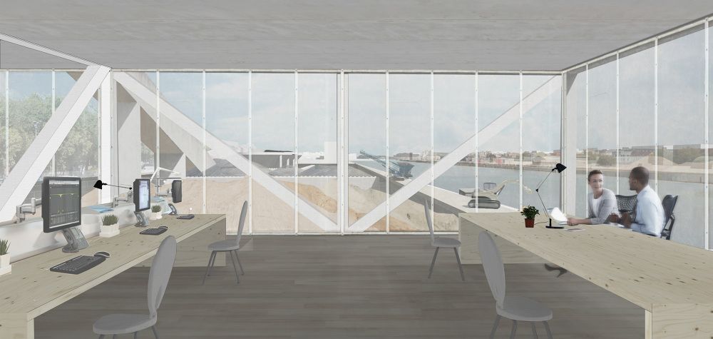 De kantoren komen zo hoger te liggen en krijgen zicht op de werking van Inter-Beton. “Je krijgt ook onwaarschijnlijke zichten over het kanaal heen”, zegt Degreef. “Een trap stijgt in het gebouw en daar kan een publieke functie komen. Het hele gebouw wordt een publiek baken, een landmark. Het gebouw is het teken dat vanaf daar de haven begint.”