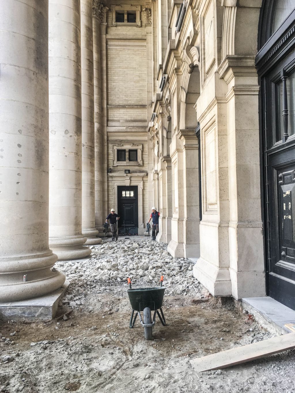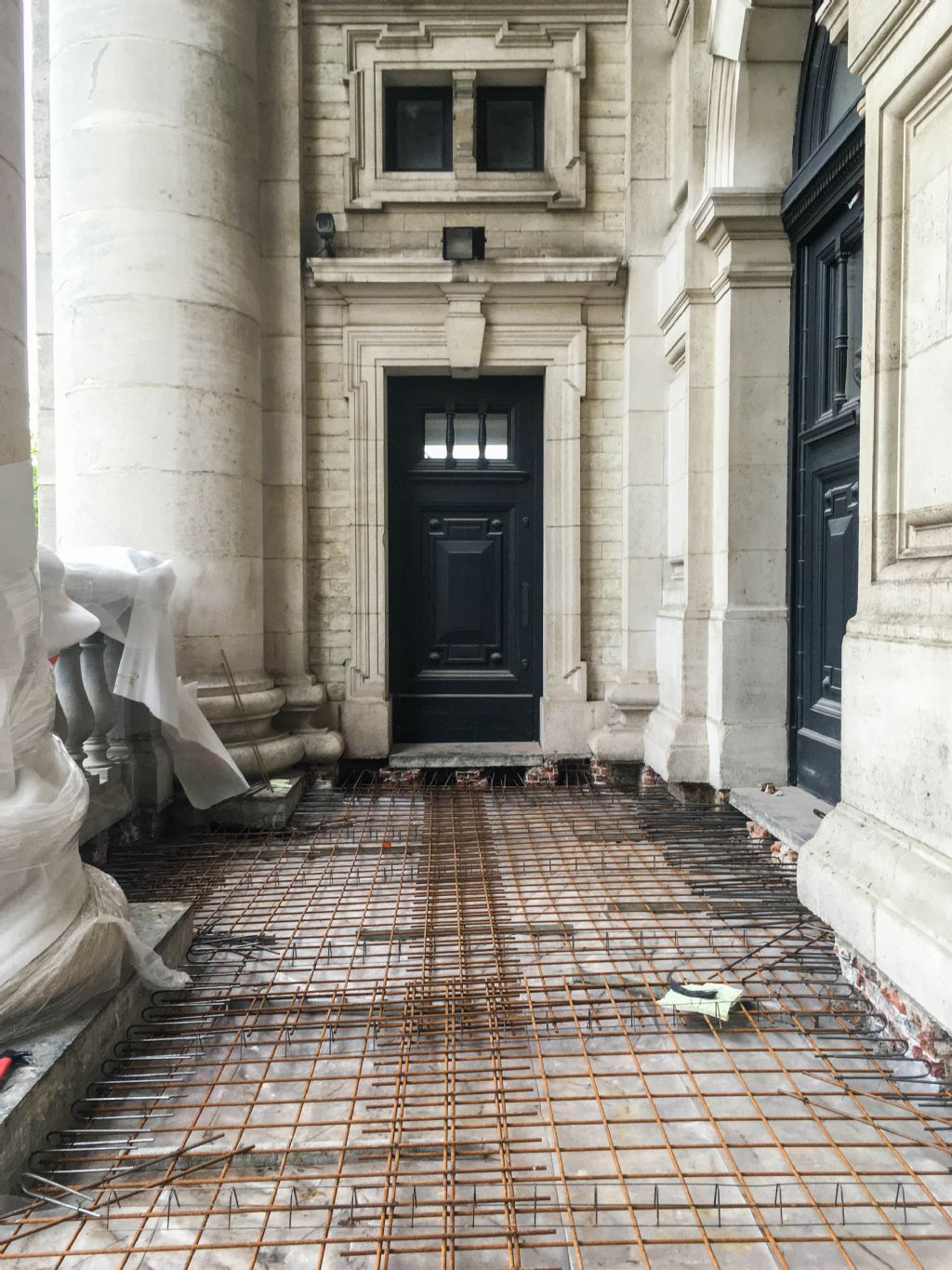 De stabiliteit van de toegangen tot het gebouw wordt verzekerd door de ondergrond van de trappenpartijen in blauwe hardsteen te consolideren. Ook de ondergrond van de mozaïek in het peristilium aan de inkom van het museum wordt gestabiliseerd. De onstabiele ondergrond heeft immers barsten veroorzaakt in de mozaïek.