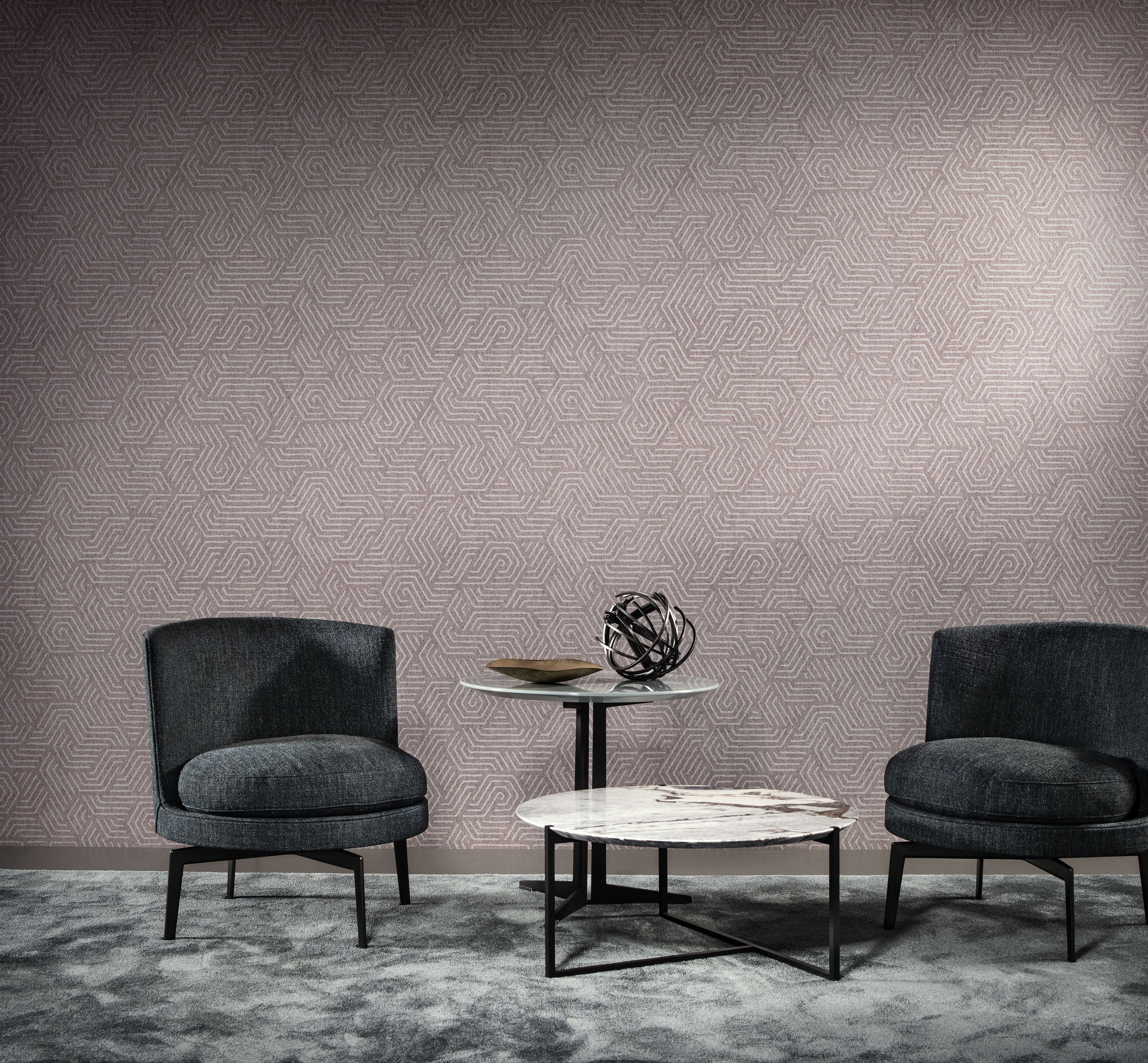 Een non-woven en basic muurbekleding met een artistieke toets is ook in het auberginepaars voor elk interieur een meerwaarde. Dessin Sweep en Dessin Flourish uit de Essentials|Modulaire collectie zorgen met hun eenvoudige en kunstzinnige geometrische vlakken en fijne textielstructuur in elke kamer voor een warme sfeer.