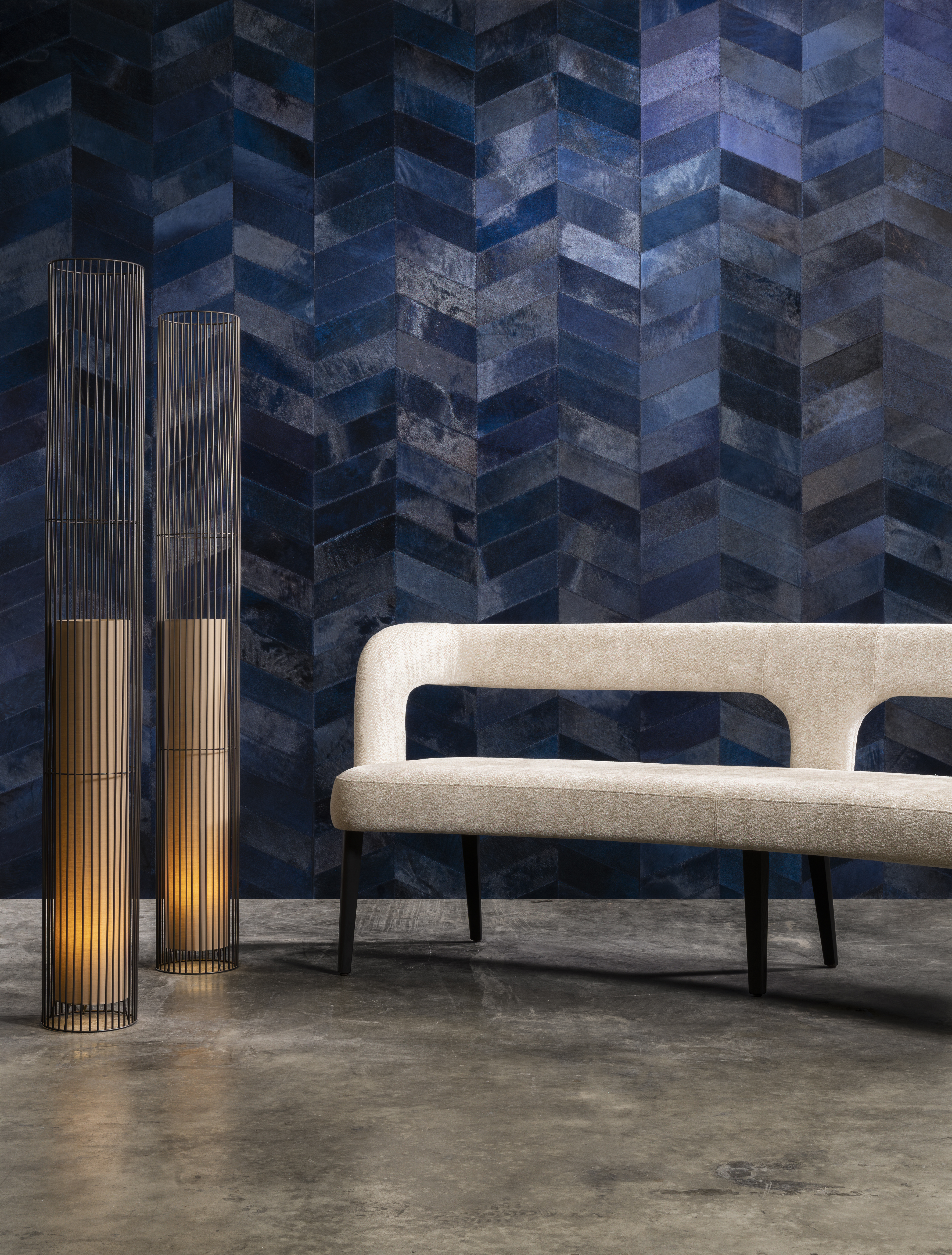 Kobaltblauw is dé aangewezen muurkleur om een ruimte van een rijke en tegelijk geborgen sfeer te voorzien. Hoewel de diepe blauwtint van oorsprong een koele ondertoon heeft, kan deze ook warm aanvoelen in combinatie met een natuurlijk en duurzaam materiaal zoals leder. De lederen muurbekleding uit de Les Cuirs collectie is voor die toepassing dan ook perfect. De grove stiknaden, onder meer te zien in het pijlvormige Dessin Montagne en het rechthoekige Dessin Aspect, voegen eveneens een stoer accent toe.