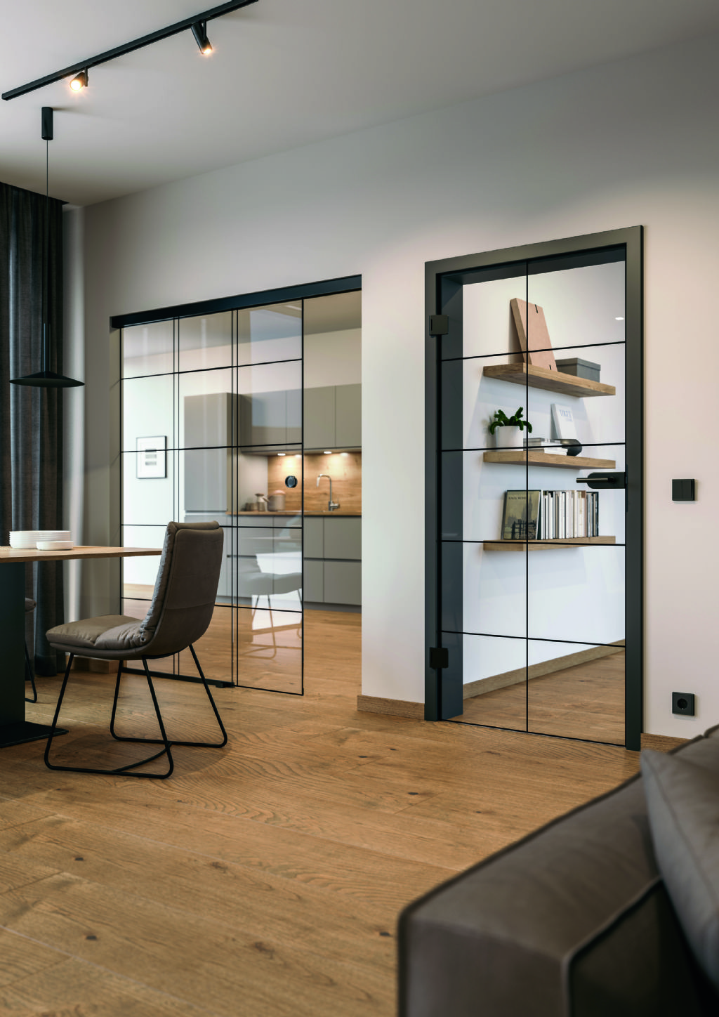 Een moderne, industriële look laat zich al een geruime tijd voelen in de interieurwereld en glas in combinatie met staal blijft domineren. Hörmann combineert glazen deuren met een stalen frame, opdat er maximaal lichtinval van de ene ruimte naar de andere kan binnenvallen. Het matzwarte ‘black.edition’ beslag van Hörmann is eveneens verkrijgbaar voor deze stalen deuren. Ook in deze stijl bestaan er een heleboel varianten, zoals draai- en schuifdeuren. Het glasgedeelte is er in blank of helderwit glas. Voor een industriële look geeft men de keuze uit twee deurontwerpen, namelijk het Loft ontwerp 1-5 met vijf panelen of het Loft ontwerp 2-5 met een totaal van tien panelen.