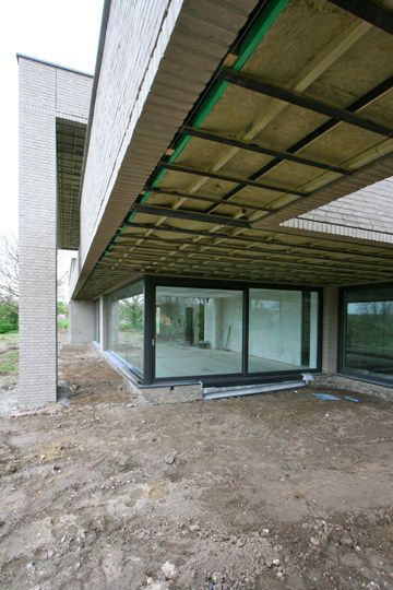Aan de zwarte draagstructuren werden in latere fase de baksteenpanelen bevestigd