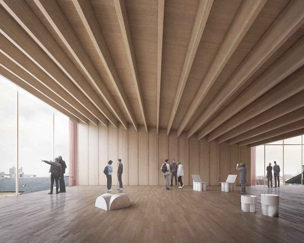 Opvallend is het speelse dakvolume, dat een nieuw ritme introduceert in de cadans van de hellende daken in de omgeving. De loft op de vierde verdieping zal als publiek balkon bezoekers een prachtig zicht op de stad bieden.