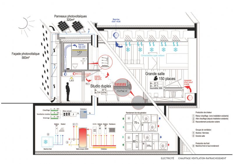 Tevens werd een gecontroleerd mechanisch ventilatiesysteem met energieherwinning (80 %) geïnstalleerd en gekoppeld aan een gemechaniseerde bypass voor freecooling tijdens de zomer. Dit systeem krijgt de versterking van thermische zonnepanelen, voor de productie van warm water voor sanitair gebruik.