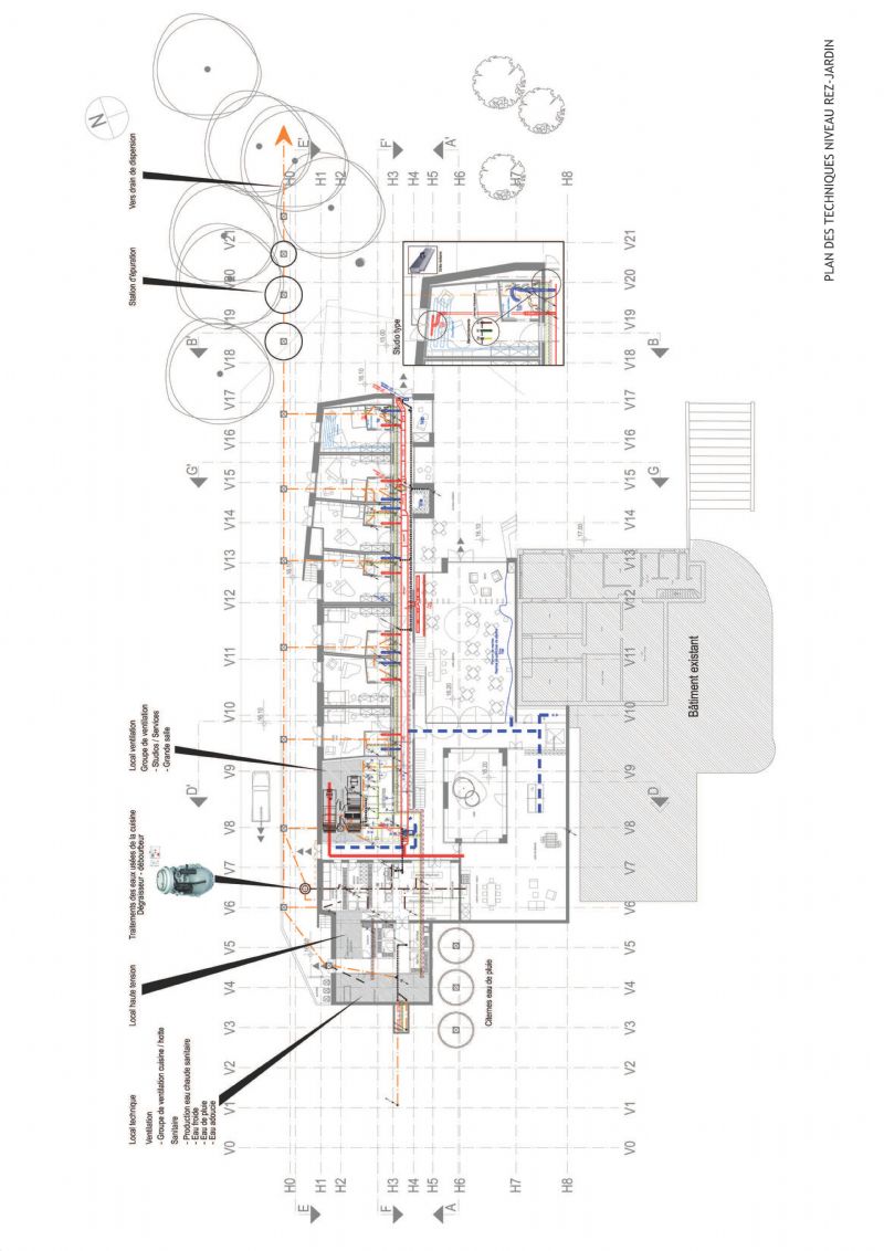 Hierbij werd rekening gehouden met de optimalisatie van elke wand in functie van zijn oriëntatie en bestemming, met berekening van het type en de breedte van elk isolatiemateriaal, integratie van een gevel met dubbele wand, de optimalisatie van de luchtdichtheid van het gebouw en studie van de verbindingsknopen ter beperking van de warmtebruggen, de afvoer van regenwater voor de toiletten en het onderhoud, de installatie van een zelfstandig waterzuiveringsstation met septische putten voor de verwerking van al het afvalwater.