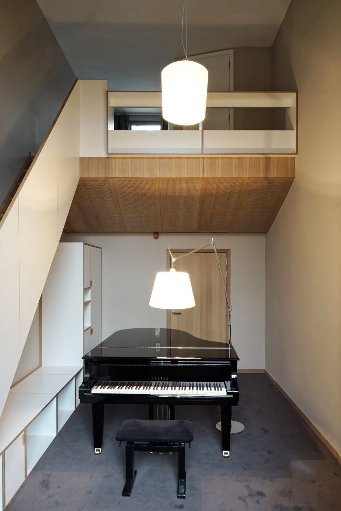 Elke woonstudio is tevens bijzonder. Gaat het nu om een duplex op de benedenverdieping, of om één niveau op de tuinverdieping, elke studio biedt verwante afmetingen, maar toch telkens iets afwijkend, door hun verhoudingen en de breukpunten in de hoeken van de wanden en het plafond om het geluid beter te leiden, zonder hinder van echo-effecten.