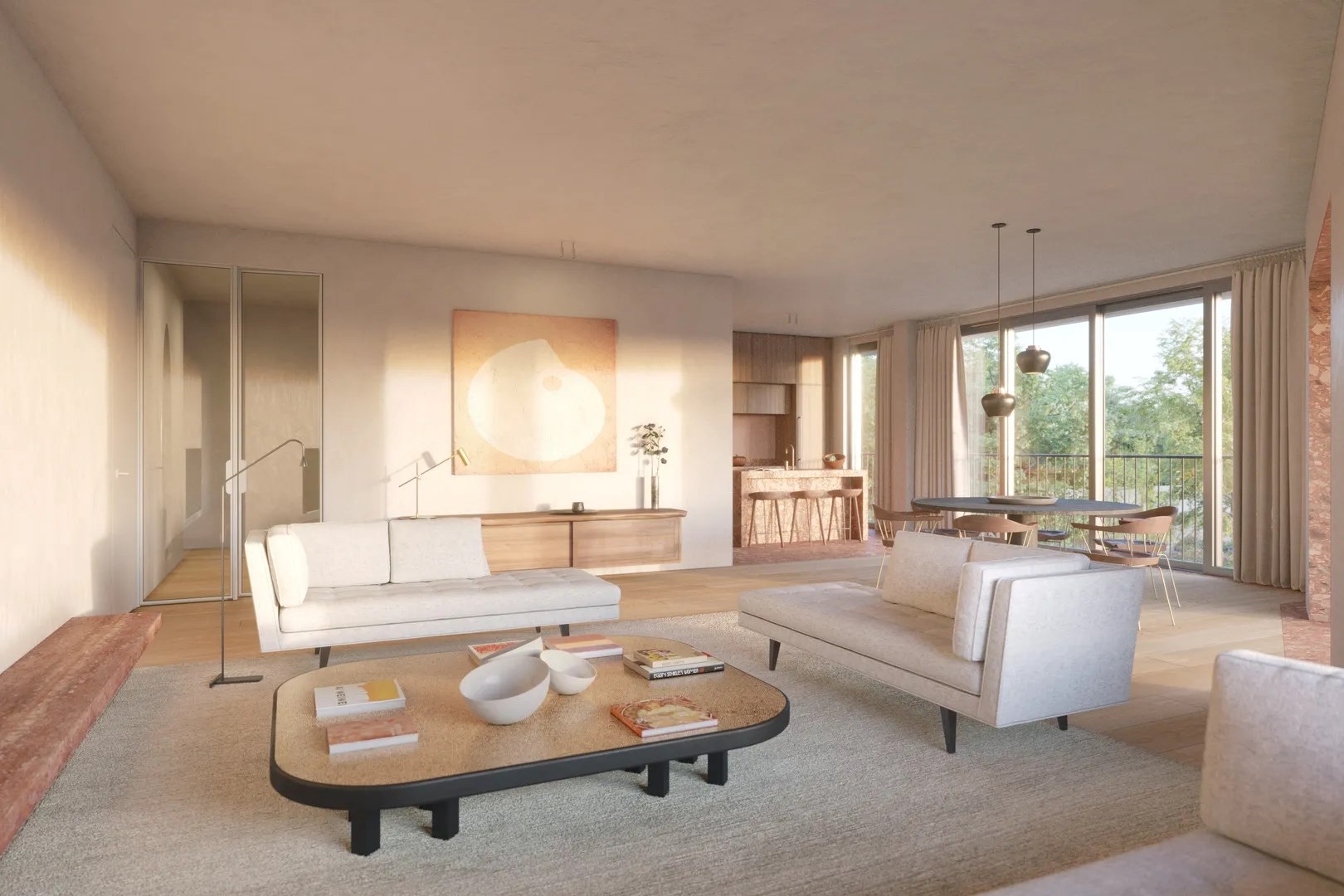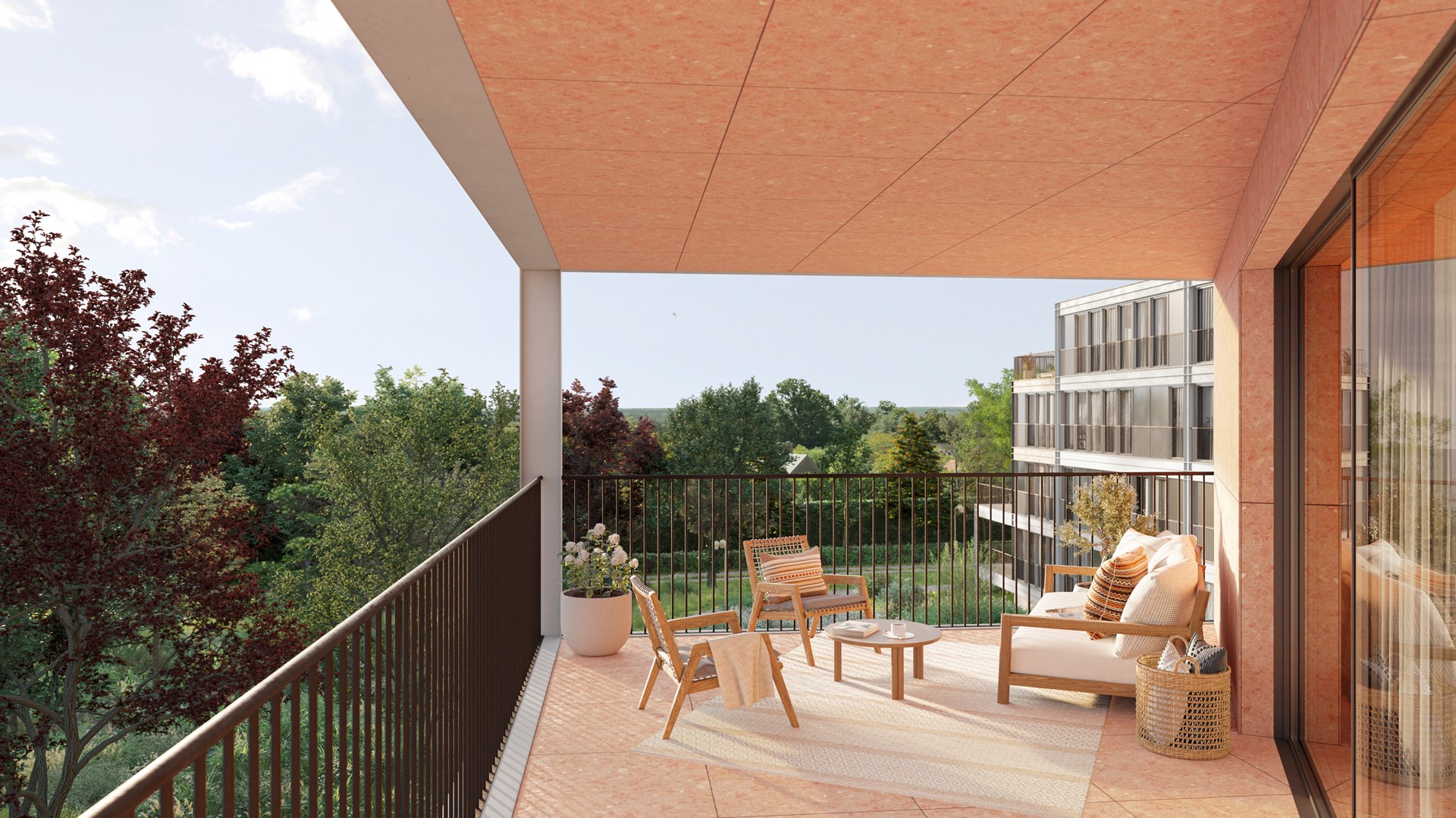 De bouwblokken zijn omhuld in een unieke, Italiaanse natuursteentint, zorgvuldig gekozen om elk gebouw zijn eigen karakter te geven. De doordachte en strakke architectuur van de gevels wordt naadloos vertaald naar het interieur door ontwerpbureau Studio Daskal Laperre. Of het nu de keukenbladen, de vloer of douchetegels zijn, interieurarchitecten Daphné Daskal en Stéphanie Laperre hebben een weloverwogen esthetiek toegepast. Rosso, verde, grigio of marrone: het kleurenpalet weerspiegelt niet alleen de connectie met de omgeving, maar smeedt ook huiselijke ruimtes met unieke elementen.