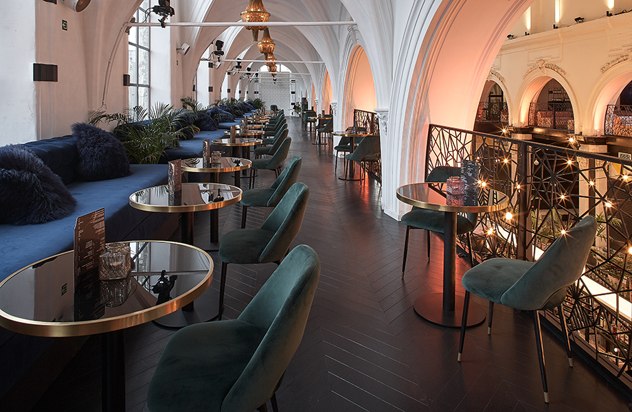 Op de bovenverdieping is de weelderige esthetiek voortgezet door het gebruik van fluwelen stoelen, donkere houten vloeren en een combinatie van verschillende soorten tafels: ronde tafels met glas en messing randen en hoge massieve tafels gemaakt van Formica laminaat in Blue Storm. Door het slimme gebruik van verschillende statafels in deze ruimte wordt een duidelijk onderscheid gemaakt tussen het bargedeelte en meer comfortabele zitgedeeltes.