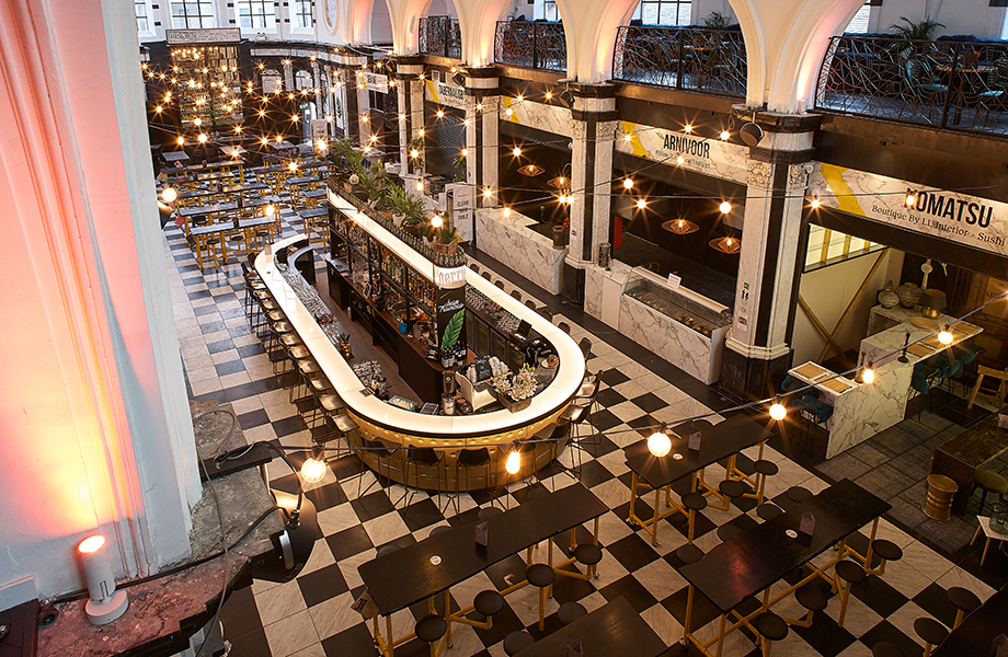 H-Club creëert een eigentijdse esthetiek door de architectuur van het oorspronkelijke gebouw te vermengen met nieuwe meubels en details. Formica: “De originele bogen en muurlijsten zijn nog steeds van de tijd dat Mozart een van zijn allereerste concerten in de zaal speelde, terwijl er aparte ruimtes zijn gecreëerd voor eetkraampjes met behulp van ons Formica laminaat in Calacatta Marble. De mix van oud en nieuw gaat verder als we kijken naar de combinatie van het gebruik van grootschalig laminaat tegen de zwart-witte stenen vloertegels en de slim verlichte bar, die allemaal een luxueuze, hoogwaardige uitstraling hebben.”