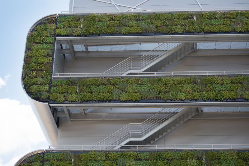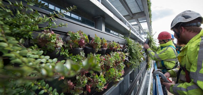 De plantenwand is opgebouwd uit het modulaire LivePanel-systeem van Mobilane, leverancier van innovatieve groensystemen. De groene wand is niet grondgebonden en bevat in totaal 11.000 verwisselbare plantcassettes. Elke rij met cassettes wordt in een aluminium gootprofiel geplaatst dat tevens dient als waterbuffer. De planten in de cassettes worden automatisch van water voorzien door een capillair watergeefsysteem dat wordt aangestuurd door sensoren in de wand. Het innovatieve systeem is onderhoudsarm, lekvrij en ongevoelig voor storingen. Bij ontmanteling is de plantenwand volledig recyclebaar.