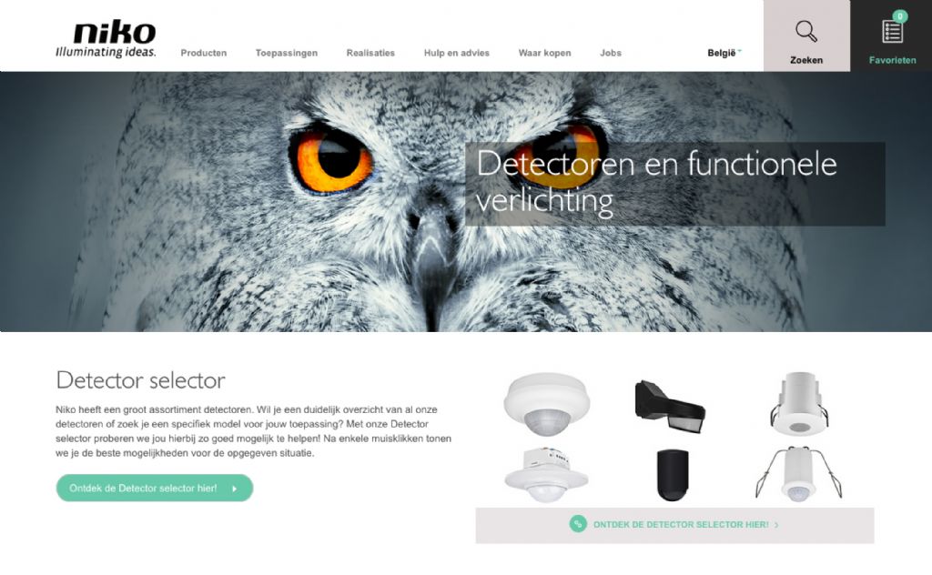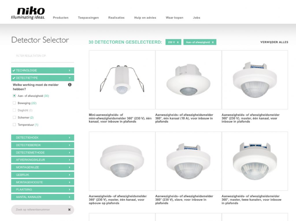 Dankzij de uitbreiding bestaat het assortiment van Niko uit meer dan 150 detectoren en armaturen voor functionele verlichting. Voor elke omgeving is er een detector: opbouw/inbouw, buiten/binnen, al dan niet dimbaar, verschillende kleuren, plafondhoogtes, bereik, toepassingen (woningen, appartementen, kantoorgebouwen, projecten, …) en technologieën (230V, 24V, KNX, Dali). Maar ook bijzondere eisen worden ingewilligd. Zo biedt Niko detectoren die niet reageren op huisdieren, maar ook detectoren die verschillende technologieën combineren of detectoren die het esthetische aspect van de ruimte ondersteunen en volledig vlak zijn.