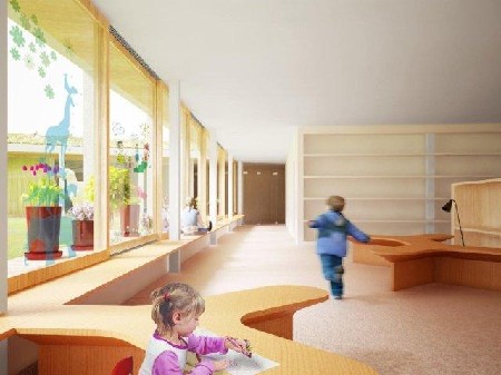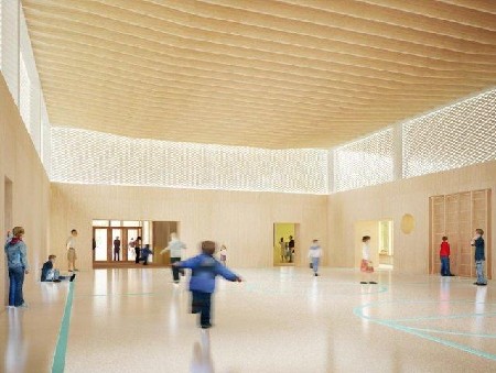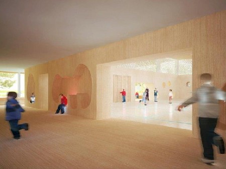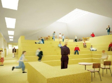 De architecten zetten in op een minder frontale en minder statische manier van onderwijs door flexibele indelingen en leerposities mogelijk te maken. De klassen van het basisschoolgedeelte zijn gegroepeerd rond een rechthoekige binnentuin. De scheiding tussen de klassen en de publieke ruimte bestaat enkel en alleen uit een soort houten opbergkast, zodat de klaslokalen echt deel gaan uitmaken van het grotere geheel. De kinderen kunnen zich met andere woorden ook buiten de begrensde omgeving van hun klas begeven. De kleuterklasjes, die als een ring rond een centrale patio liggen, bevinden zich aan de andere kant van de multifunctionele hal. Voorts zijn er nog twee andere blokken met een refter, een theaterklasje, een berging, administratieve ruimtes en een leerkrachtenzone.