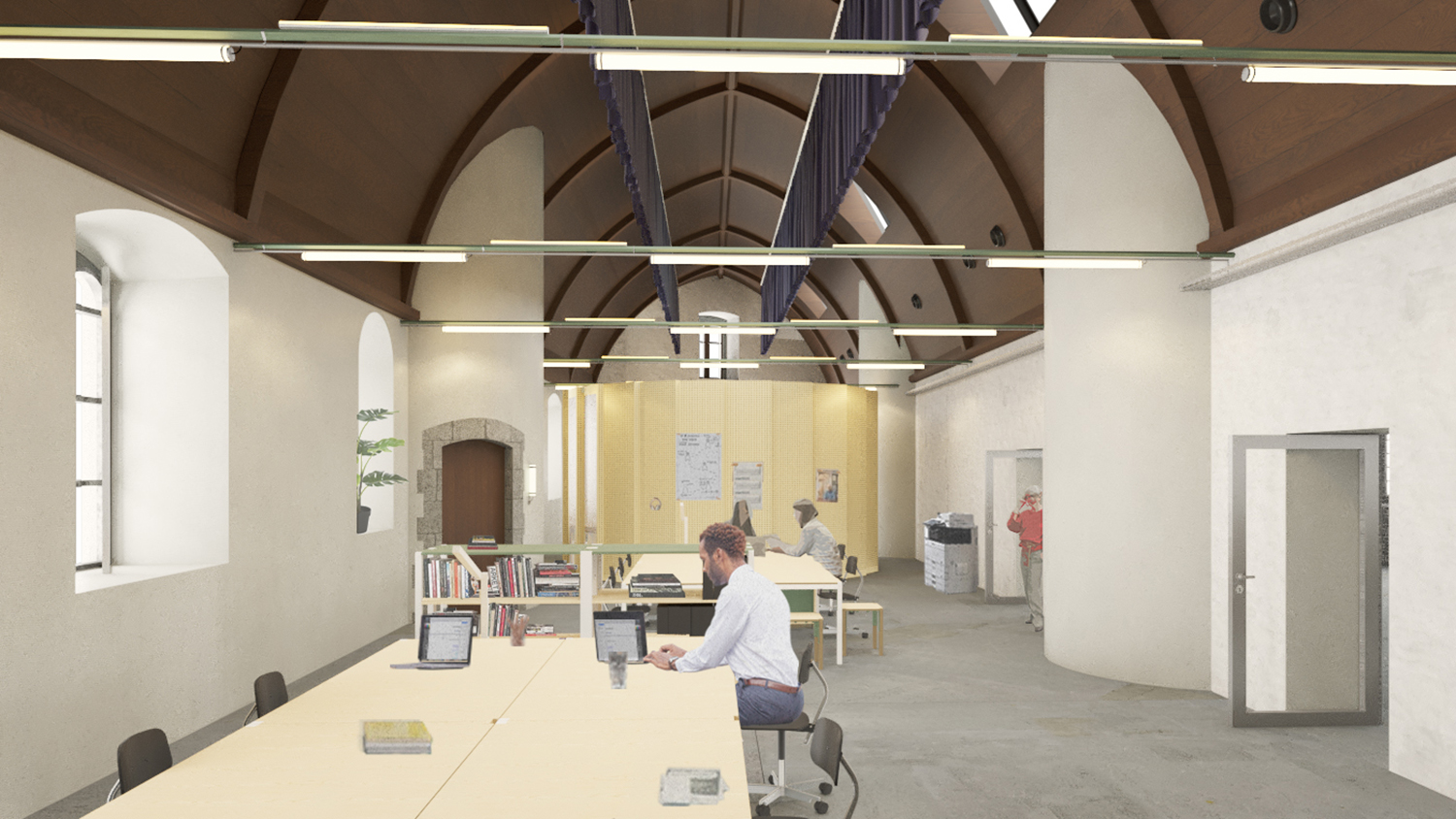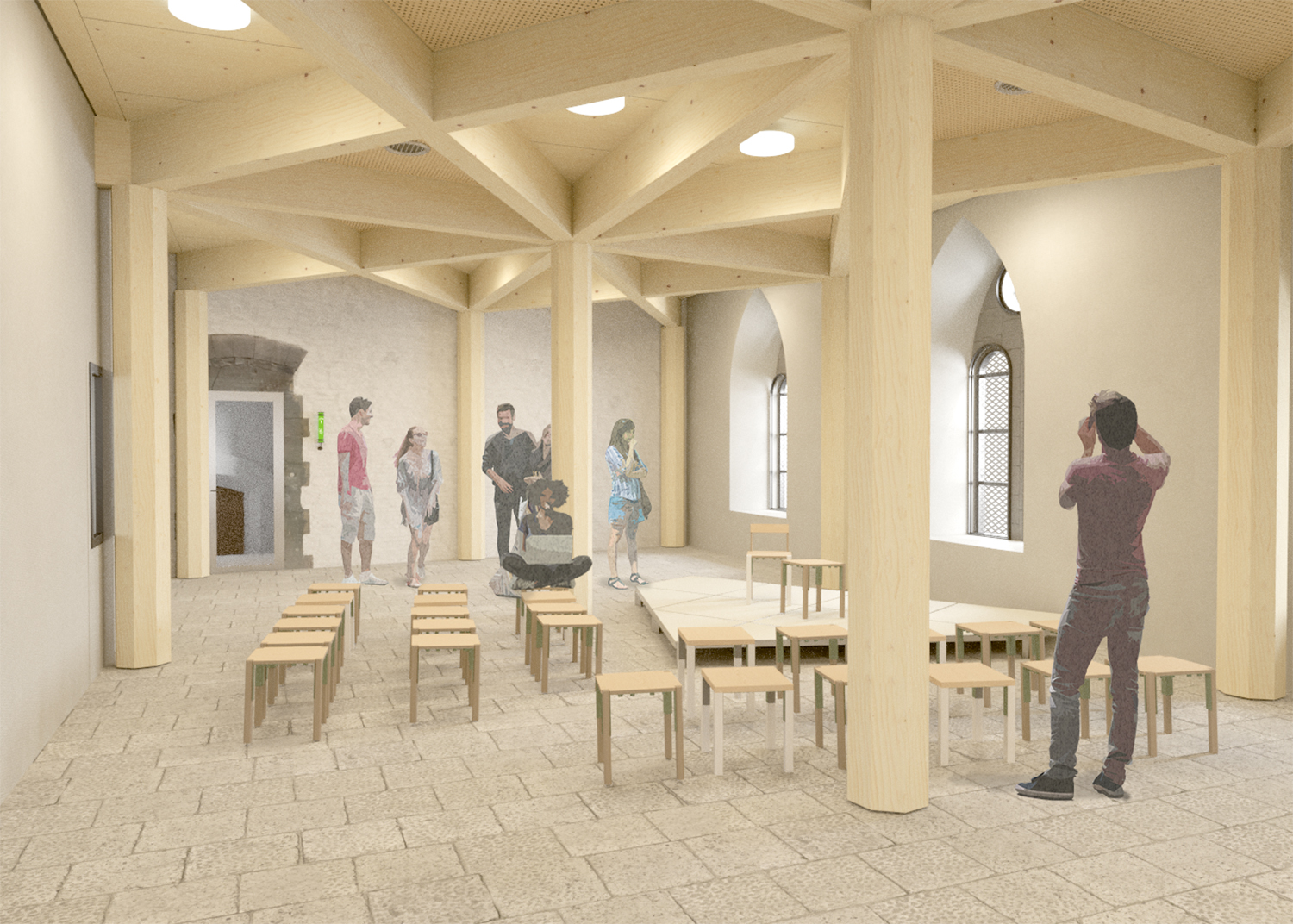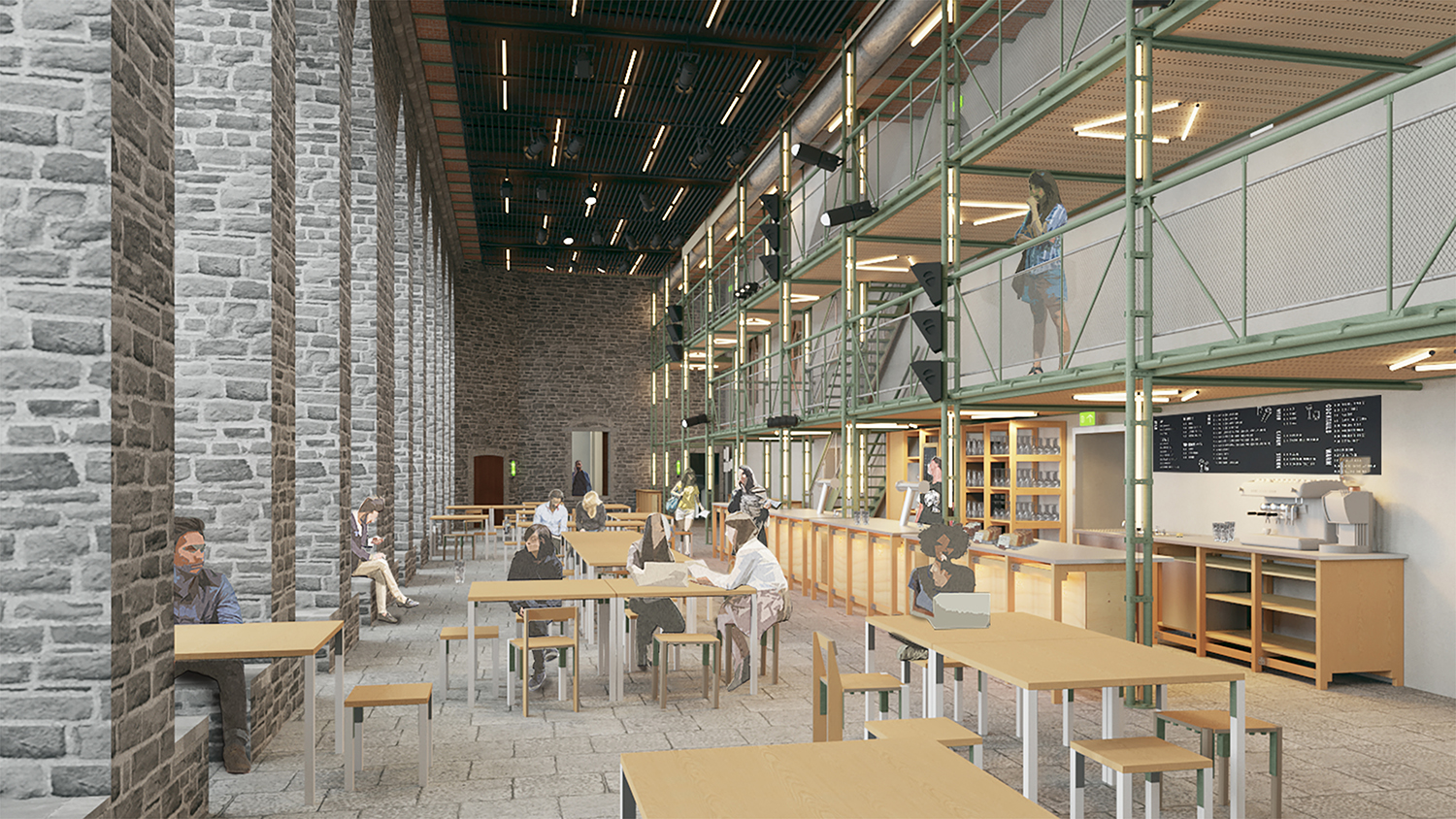 De hedendaagse ingrepen zijn bewust terughoudend en precies geplaatst. Waar historische vloeren ontbreken, wordt een nieuwe houten verdieping toegevoegd, aansluitend bij een niet-uitgevoerde ontwerpintentie van Verhaegen. Bestaande elementen krijgen een tweede leven, zoals theatermeubilair dat wordt opgebouwd uit voormalige archiefrekken. Ook de kade aan de Schelde wordt opnieuw ingericht en publiek leesbaar gemaakt, als onderdeel van de relatie tussen gebouw en stad.