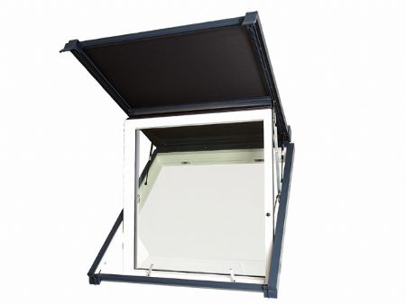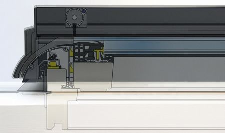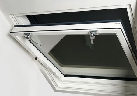 Het raam kan tot 15° naar binnen toe kiepen en kan worden geblokkeerd. Op die manier is het vergrendeld tegen inbraak en beveiligd voor kinderen. Een elektrisch screendoek houdt de zonnewarmte buiten nog voor die kans krijgt het glas te verwarmen fungeert bovendien als hor.