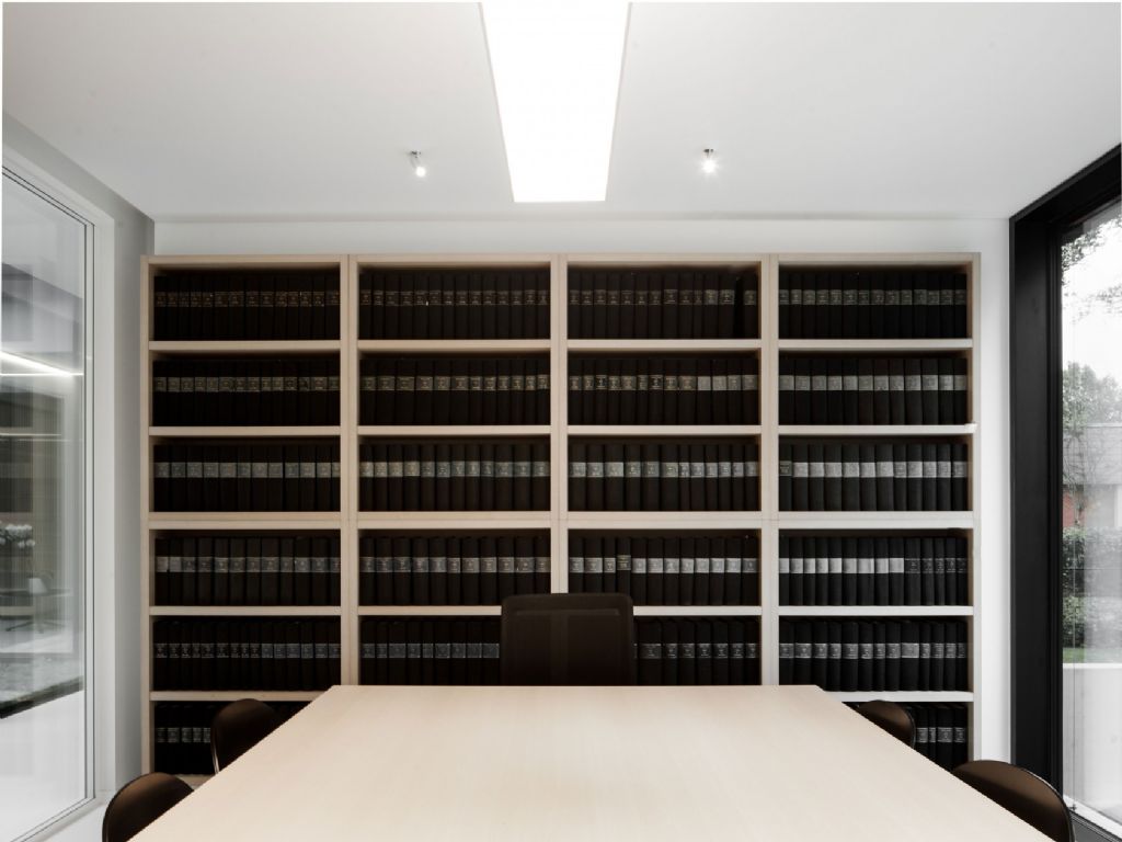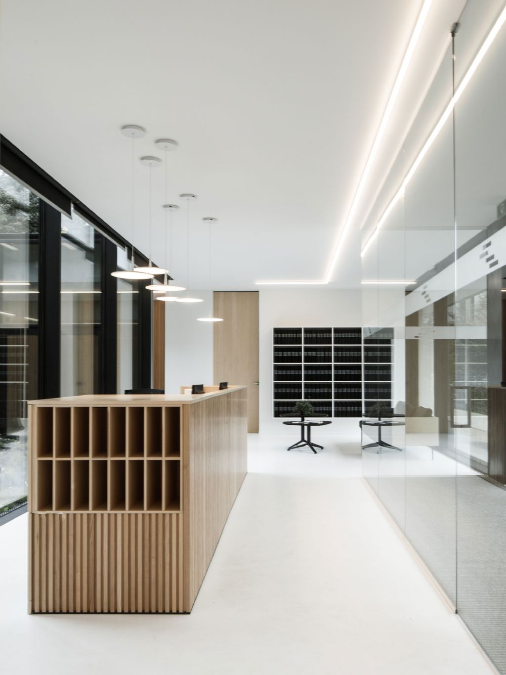 Het interieurconcept van het notariaat diende een minimalistische eenvoud en rust uit te stralen, wat gerealiseerd werd door als hoofdkleur wit te gebruiken. De witte gietvloer creëert, in combinatie met accenten in essenhout, de verdiepingshoge deuren en het elegante meubilair, de juiste sfeer.