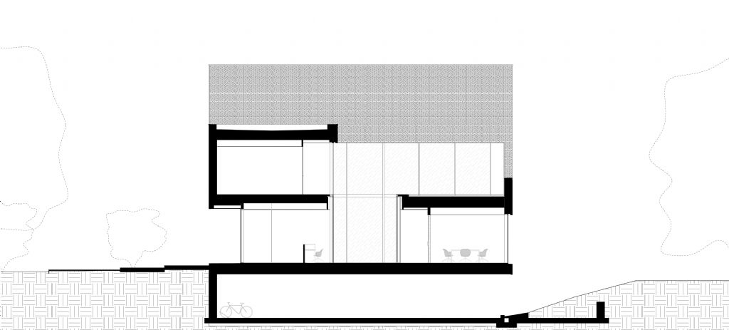 Het project omvatte een notariaat met erboven een studio, eronder een half verzonken parking en omgevingsaanleg. De vraag van de bouwheer om te voorzien in twee wachtzones bij de aktezalen resulteerde in een open plan, waarbij de centrale patio als structurerend middel werd ingezet om privacy te creëren zonder dat de transparantie van het open plan verloren zou gaan.