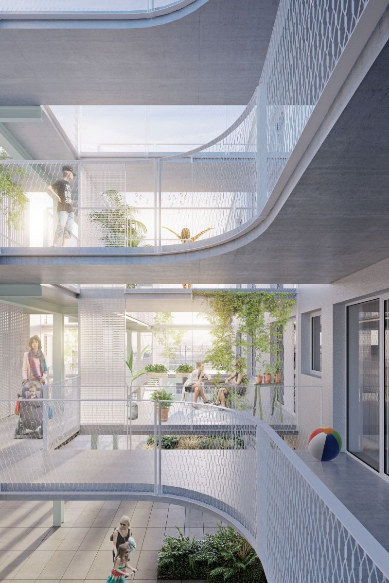Het “samen-leven” werd bijzonder goed uitgedacht door de architecten. Zo bevorderen de talrijke openbare ruimten ontmoetingen (gedeelde ruimten op het dak, galerijen met terrassen, collectieve moestuinen, serre, speelplein). De rond een ruggengraat verspreide ateliers zorgen voor interactie tussen de verschillende gebruikers, die elkaar ook kunnen ontmoeten in de voor hen voorziene gemoedelijke ruimte.